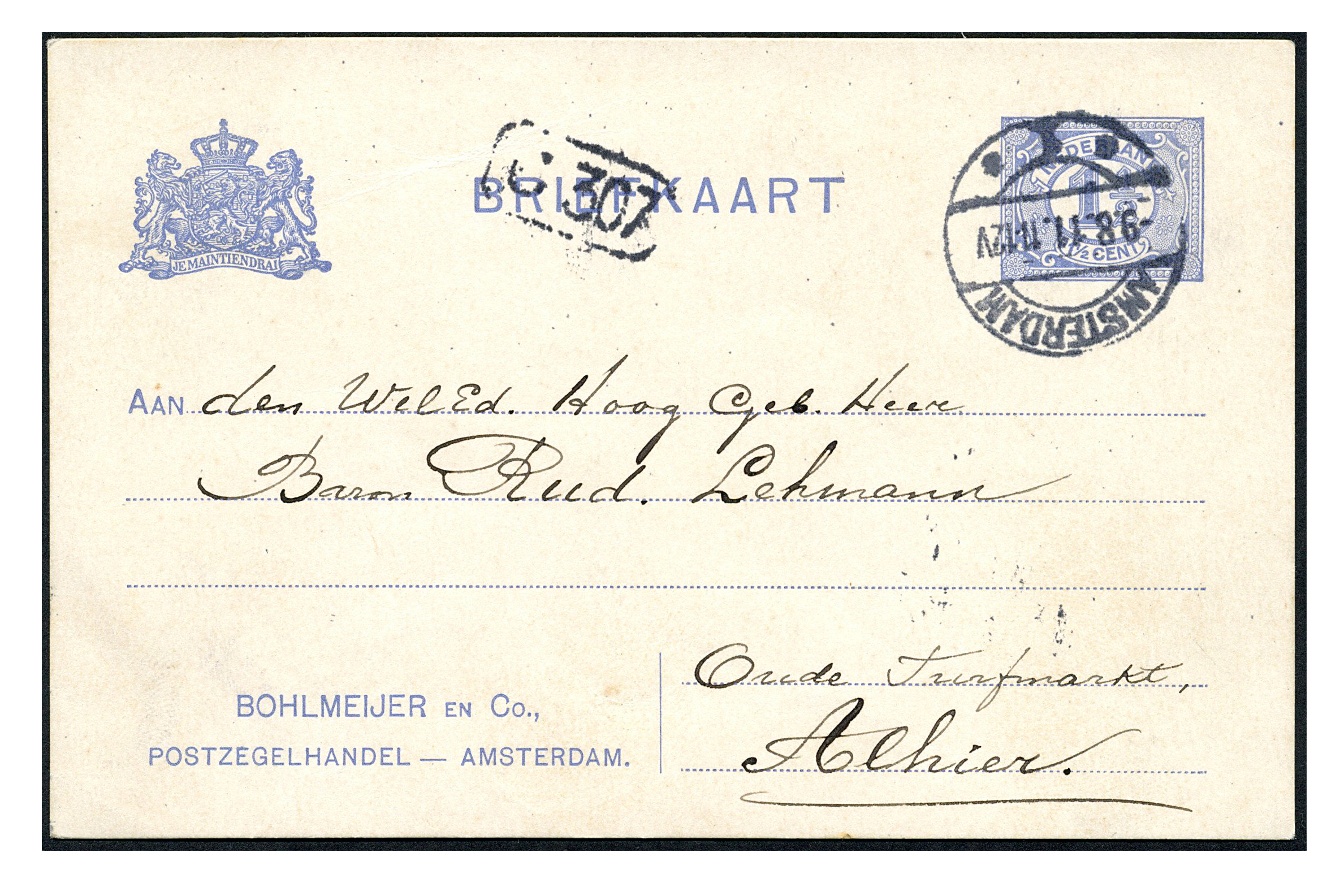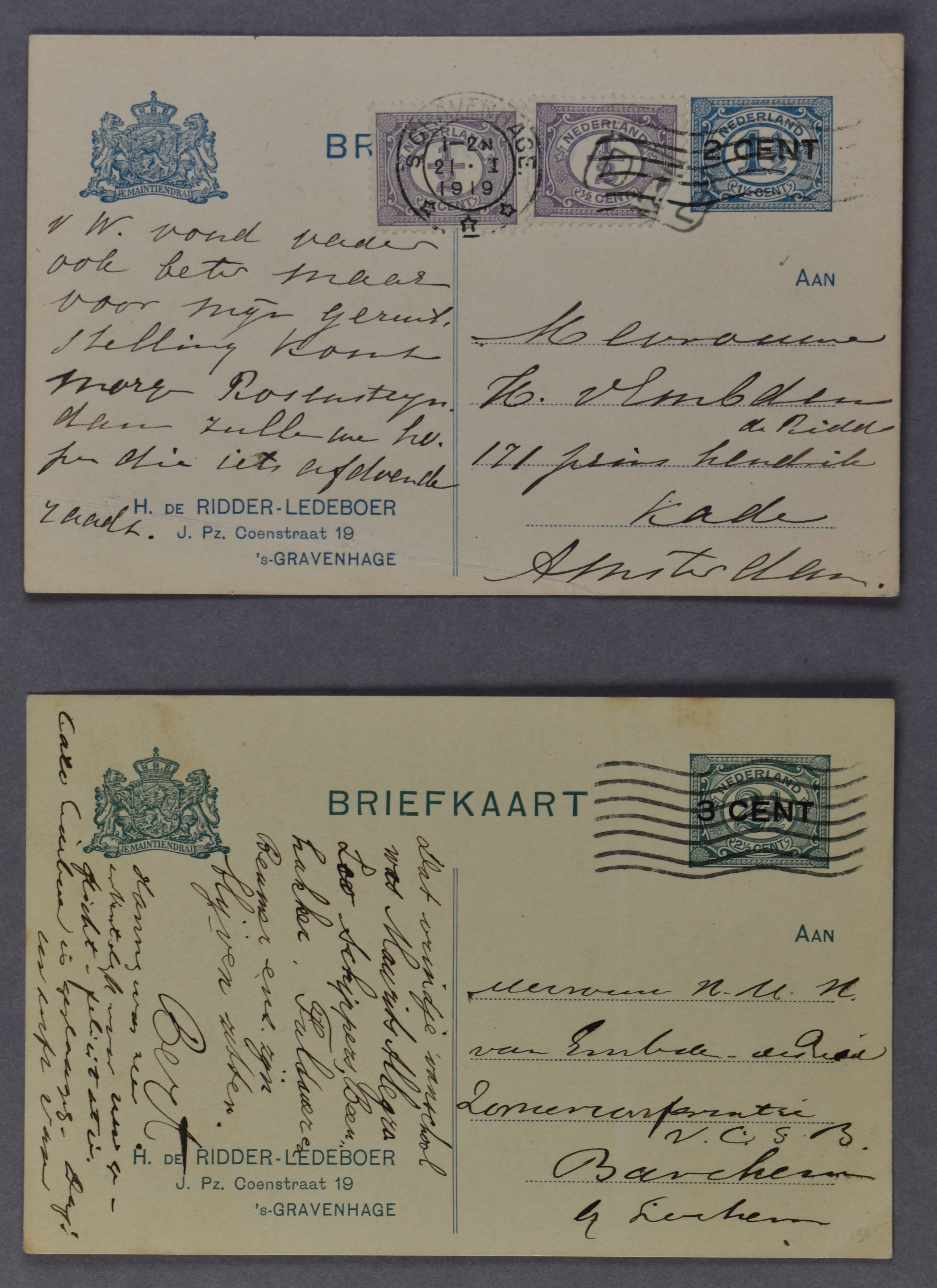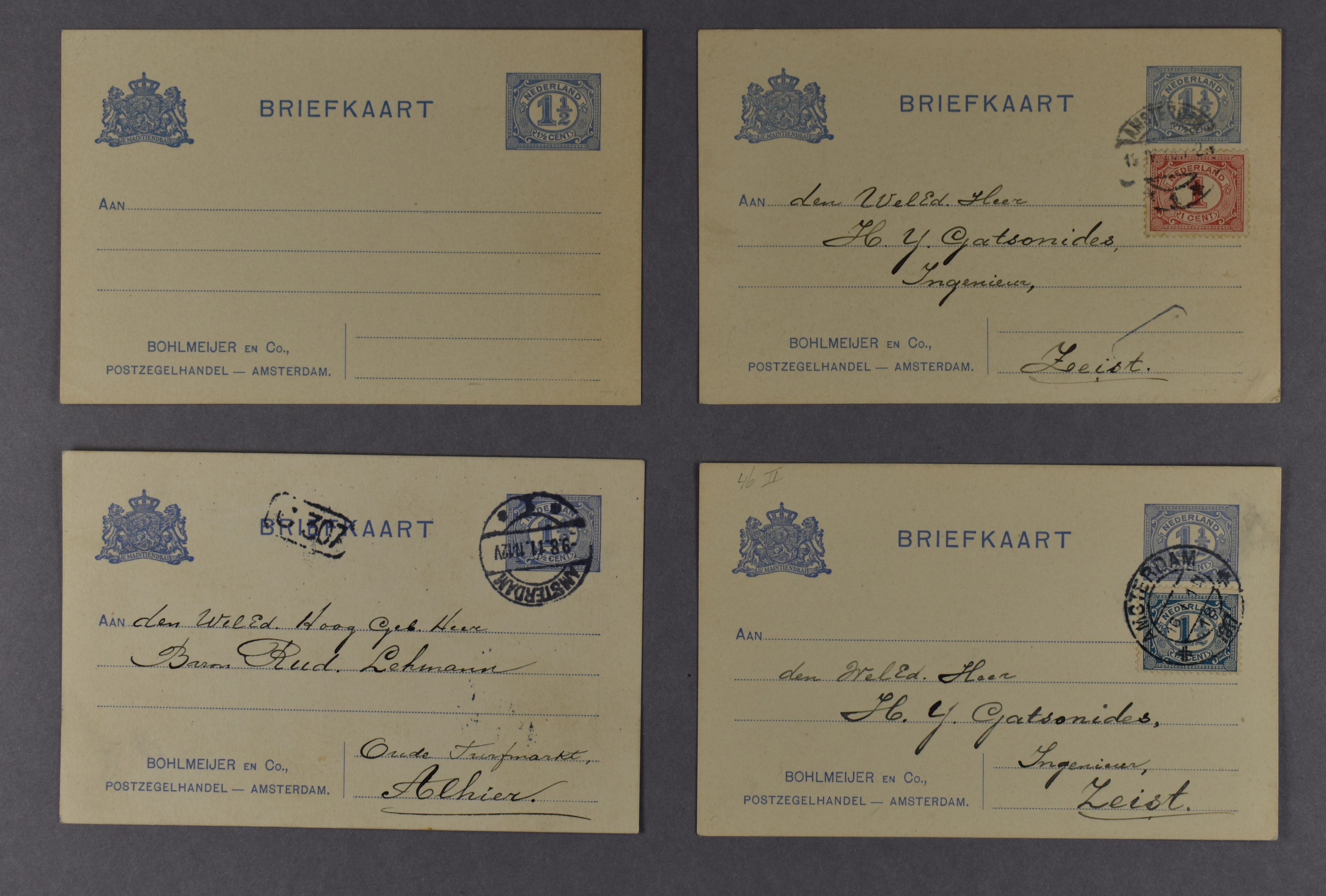 Particuliere briefkaart van 1½ cent P78-IIa, kaart met bijfrankering van 1 cent op 19-4-1916 naar Zeist, kaart met bijfrankering van 1½ cent blauw op 16-1-1917 naar Zeist, kaart zonder bijfrankering op 9-8-1911 lokaal te Amsterdam,
