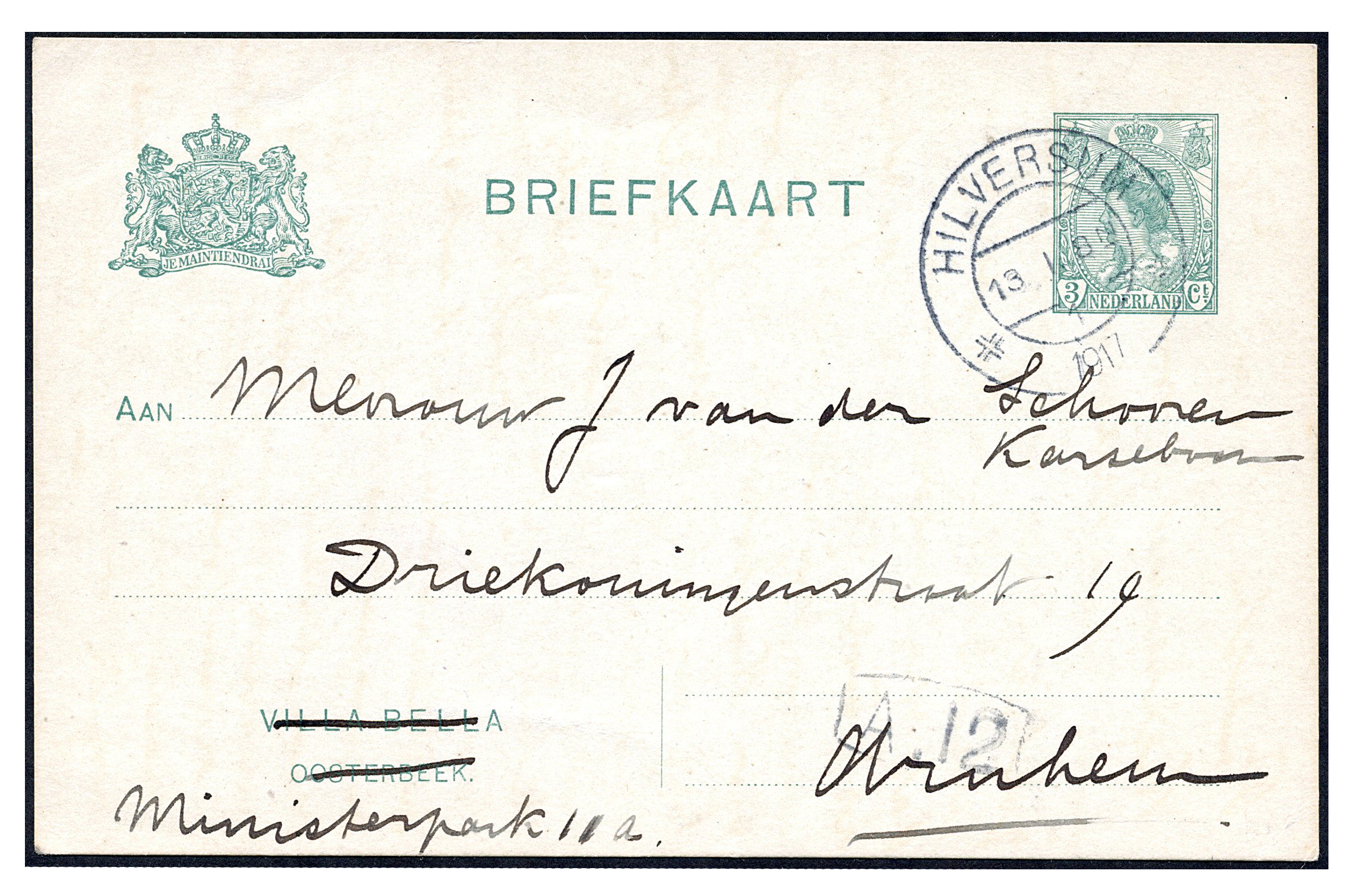 Particuliere briefkaart van 3 cent Bontkraag P90a-II-b, twee niet-filatelistisch gebruikte kaarten waarvan de gedrukte afzender is doorgehaald en gewijzigd, van Hilversum 13-1-1917 naar Arnhem en van 's-Gravenhage 23-3-1917 naar hetzelfde