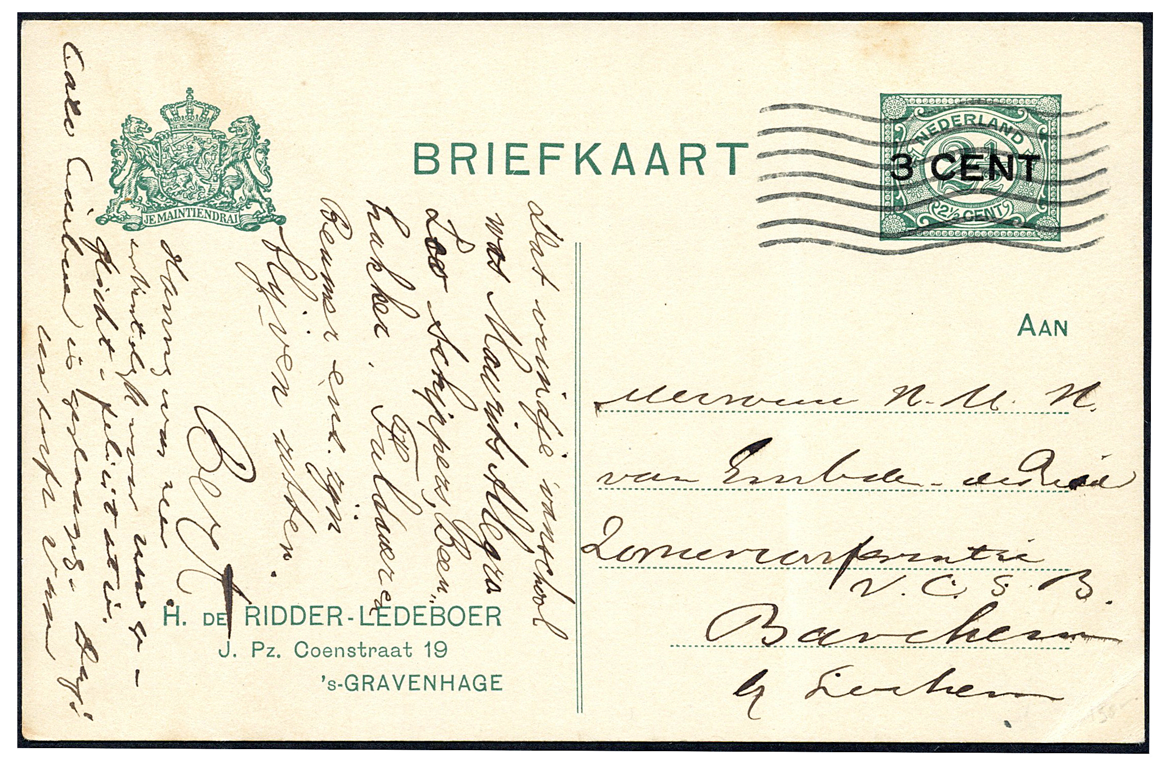 Particuliere briefkaart van 3 cent op 2½ cent P96a-I-d van 's-Gravenhage 5-8-1917 (plaatsnaam in machinestempel op de kaart niet afgedrukt) naar Barchem. Tevens G94a-I-b (links hoekvouw) met 2x ½ cent bijgefrankeerd (1 ex. omgevouwen