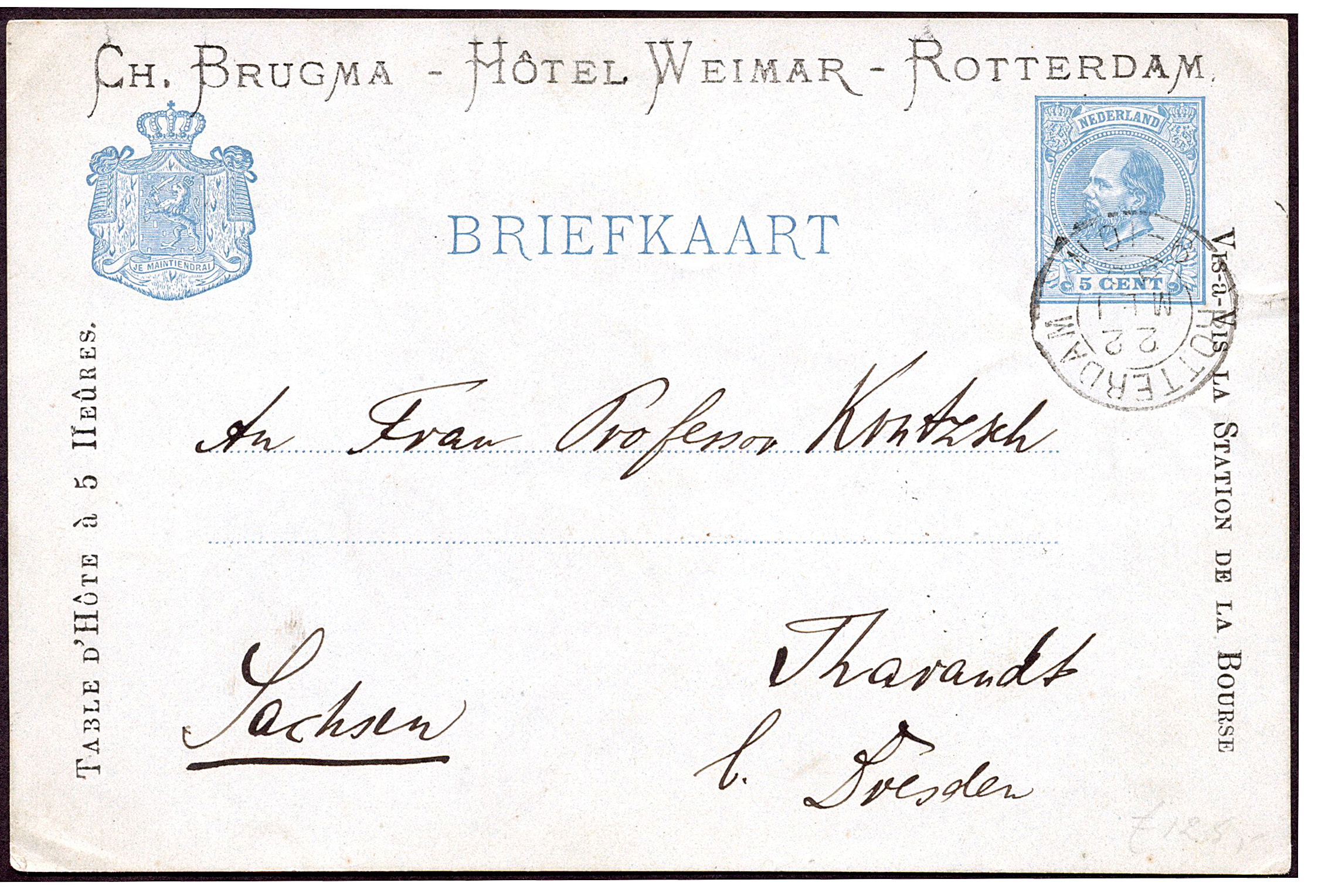 Bk. G25 met particuliere bedrukking langs linker- en rechterrand met bovenaan 'Ch. Brugma - Hôtel Weimar - Rotterdam' van Rotterdam 22-5-1885(€) naar een hooggeleerde dame te Tharandt (D) (Image)