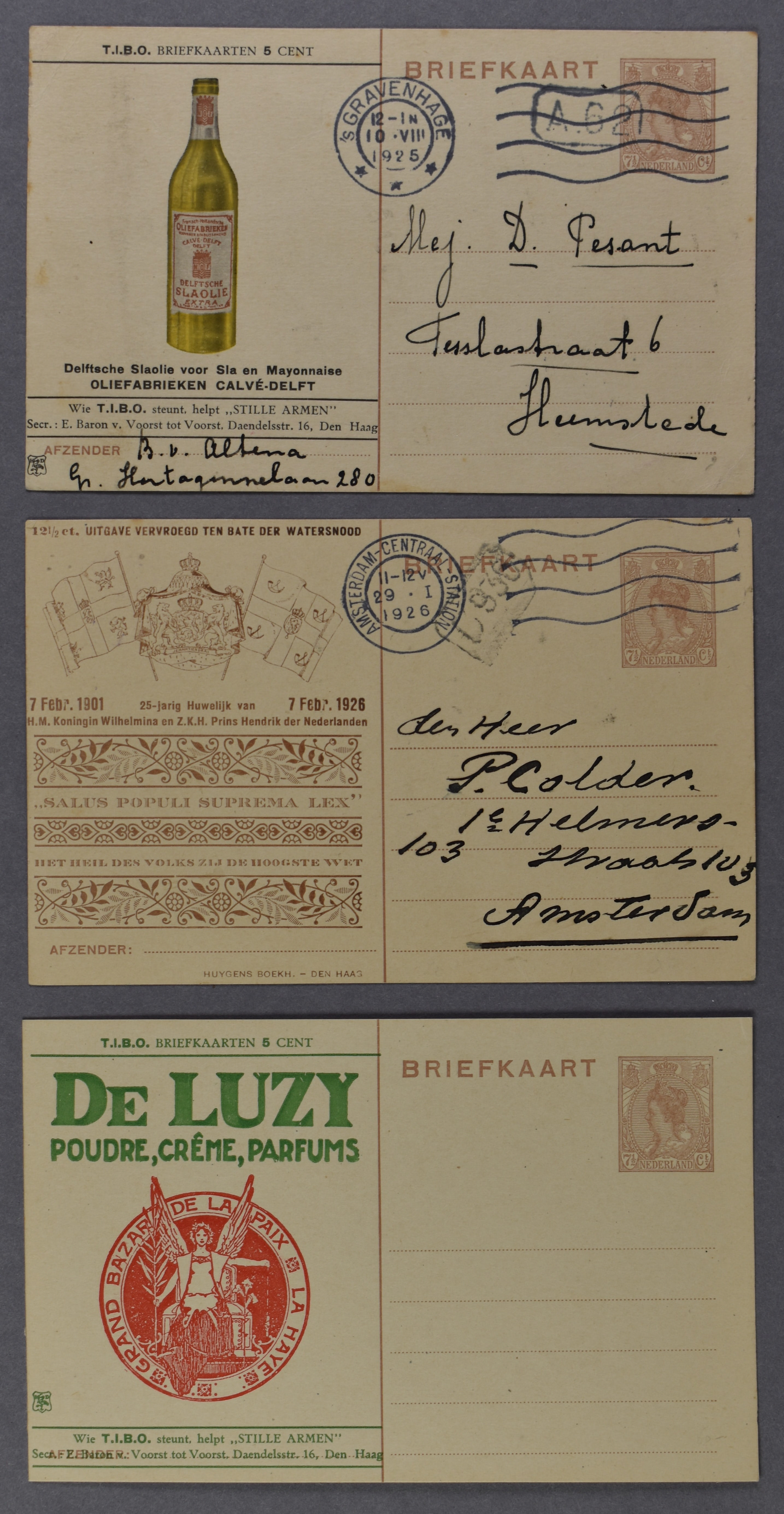 Particulier bedrukte bk. TB14, ongebruikt, TB15 niet-filatelistisch van 's-Gravenhage 10-8-1925 naar Haarlem en WAT2 (Broekman) van Amsterdam C.S. 26-1-1926 naar Amsterdam (Image) (Image2)