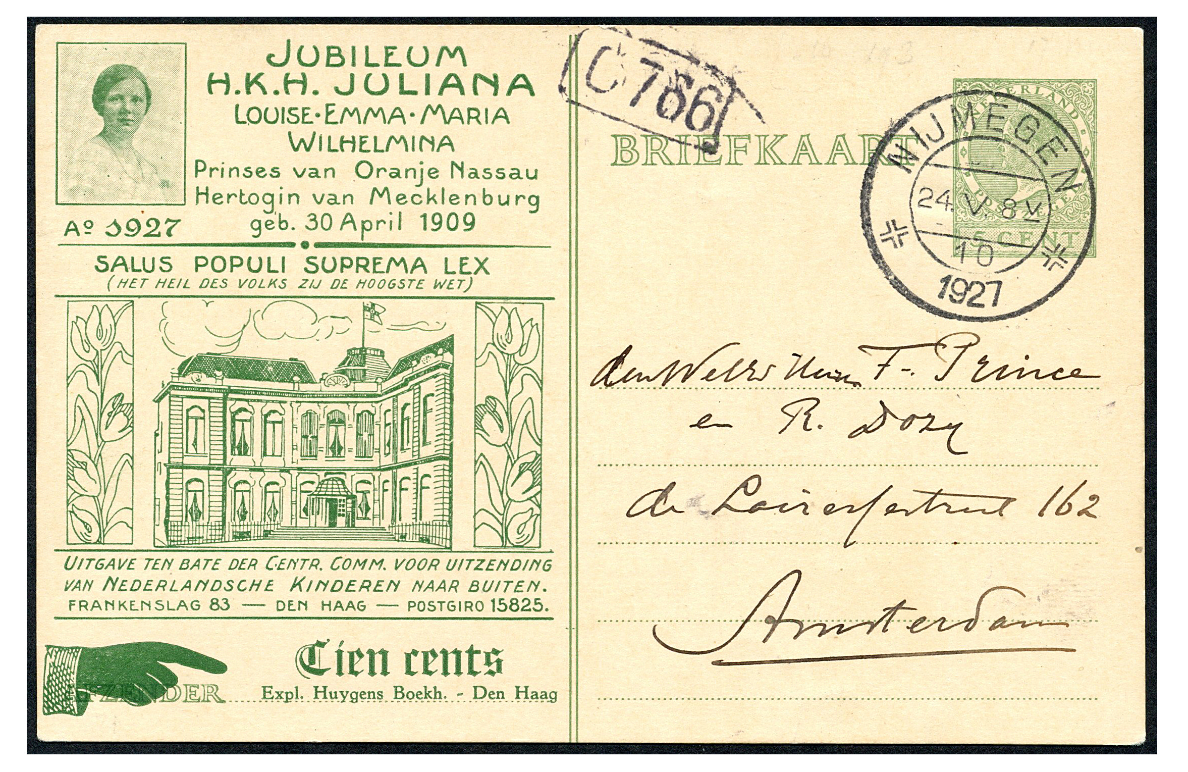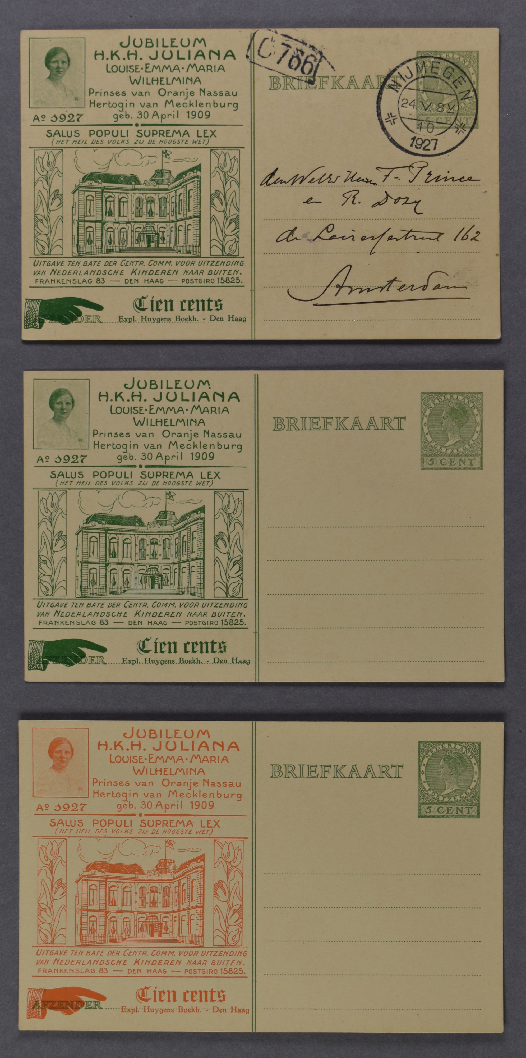 Particulier bedrukte bk. KIN1 ongebruikt en KIN14, ongebruikt alsmede een niet-filatelistisch verzonden kaart van Nijmegen 24-5-1927 naar Amsterdam, drie schaarse prachtkaarten (Image) (Image2)
