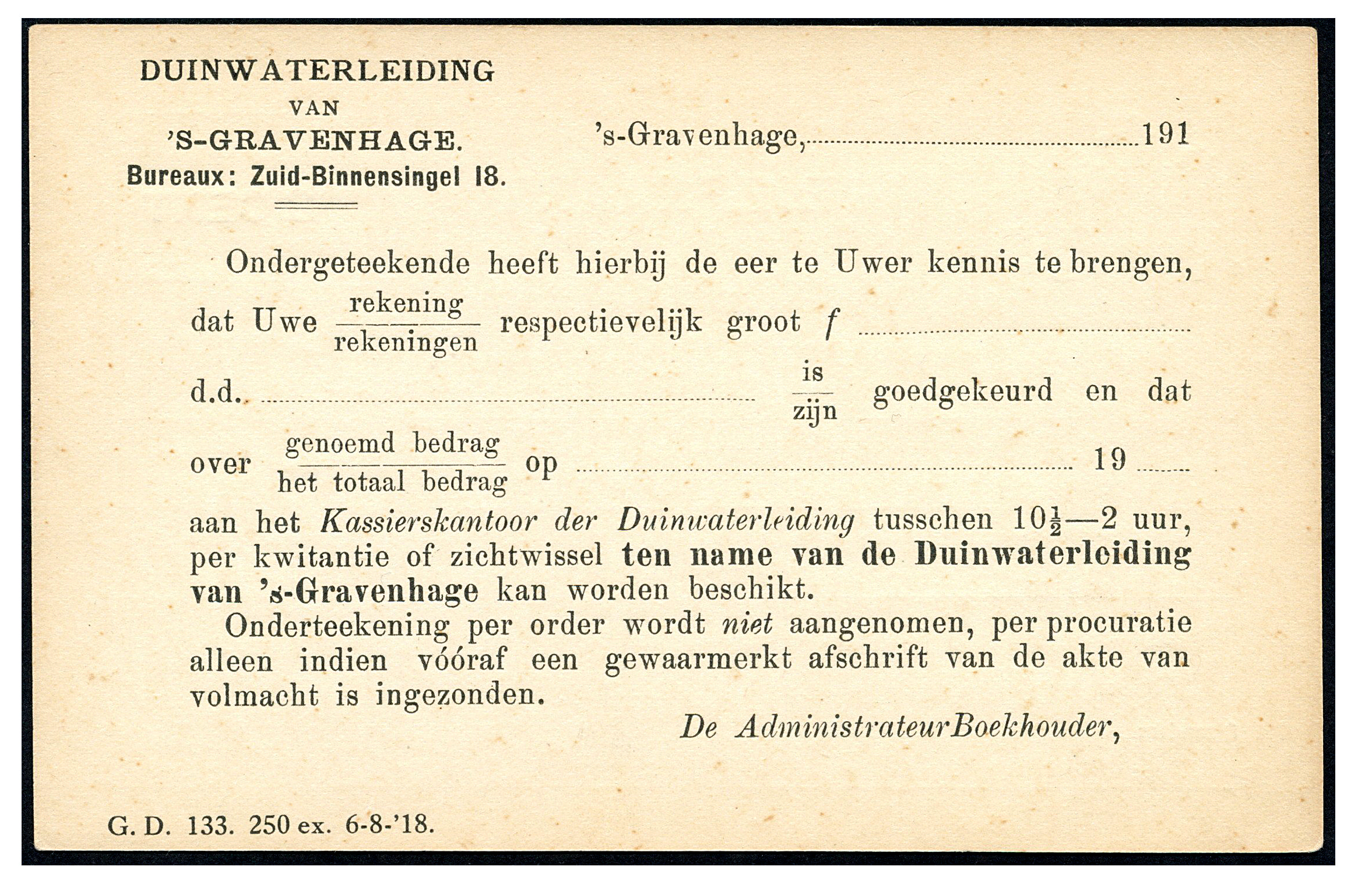 Particulier bedrukte bk. van de Duinwaterleiding van 's-Gravenhage DW94a-IIb met op az. 'G.D. 133. 250 ex. 6-8-'18.'. Recentelijk ontdekt, alleen ongebruikt bekend (Image)