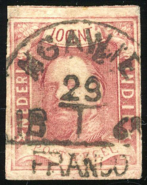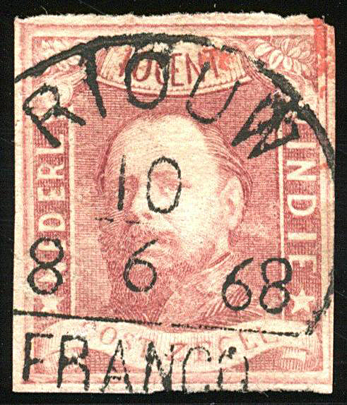 PASSOEROEAN op nr. 1. Prachtex. met mooie afst. van 9-3-1867. Er is ook een strip van 5 ex. bekend, afgestempeld op dezelfde datum. V.125 (Image)