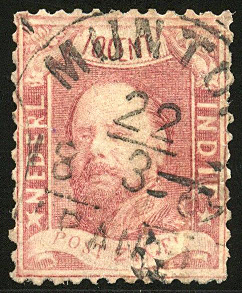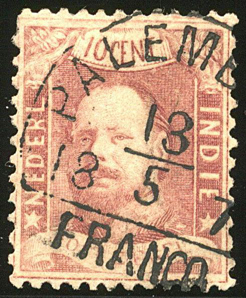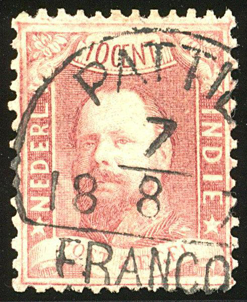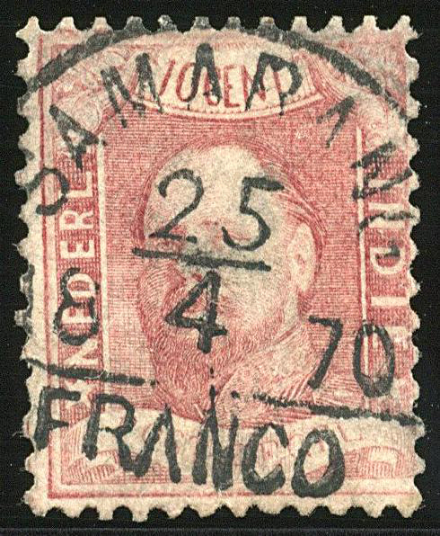 PONTIANAK op nr. 2. Zeer fraaie zegel (az. boven dun) maar wel met vrijwel ideale afst. van 12-10-1870. Slechts 4 afst. op nr. 2 bekend waarvan dit de laatst bekende datum is. V.400 (Image)
