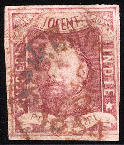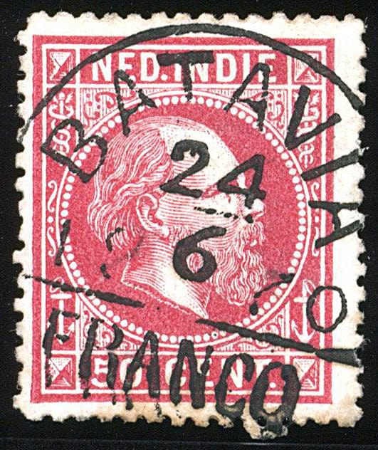 Puntstempel 1 = Weltevreden op 10 cent nr. 1. Prachtex. met duidelijke afdruk van Bu. type 1/1 uit 1874 (zie: De Postzak nr. 153, sep. 1987). Zeer laat gebruik van deze zegel. Mogelijk een unicum! (Image)