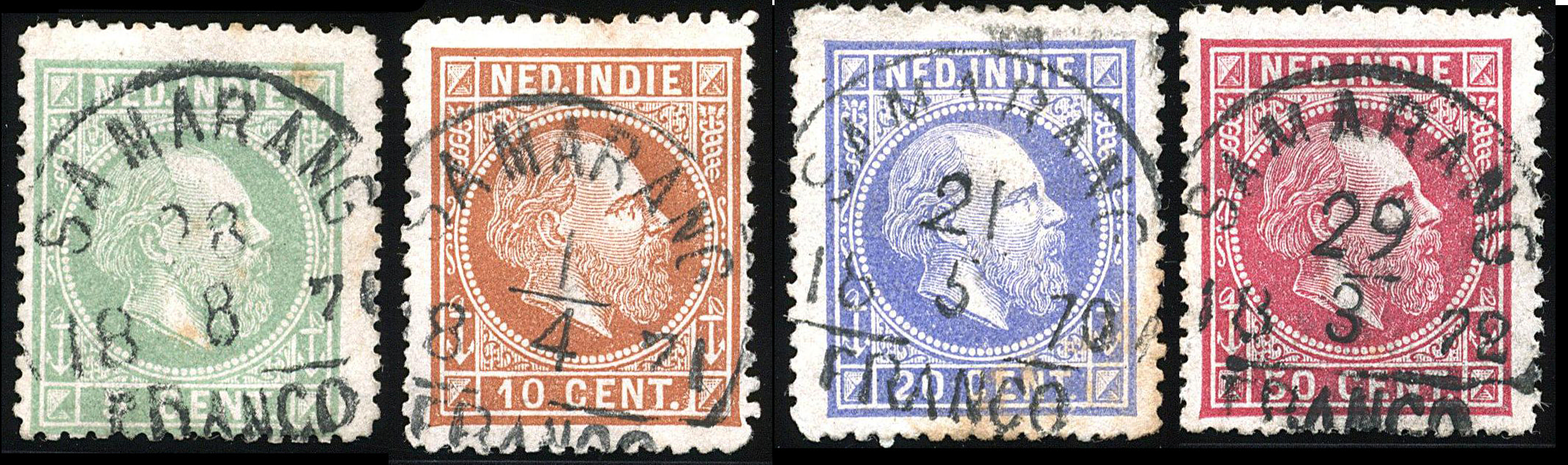 SAMARANG op de 5, 10, 20 en 50 cent in tanding A. Vrijwel pracht tot prachtex. allemaal met ideale afst. op de 5 cent van 28-8-1870 (type I met smalle M), de 10 cent van 1-4-1871 (type I met smalle M), de 20 cent van 21-5-1870 (type II