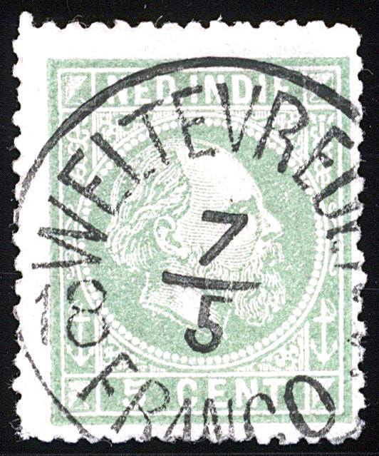 WELTEVREDEN rond-franco op 5 cent nr. 8A. Prachtex. met voor dit stempel een superbe afdruk van 7-5-1873 (jaartal van dit stempel vaak weggevallen). Mooier kan niet! In april 1873 kreeg het kantoor Weltevreden het eerste poststempel met