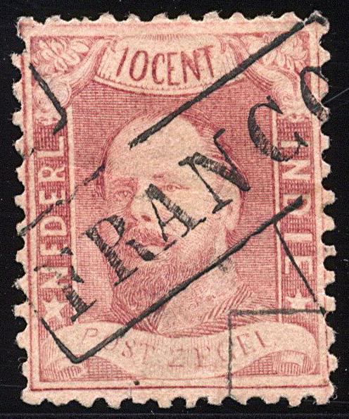 Naamstempel PRIAMAN in kader, tevens FRANCO, op 10 cent nr. 1. Prachtex. met volledige, diagonale afdruk van dit naamstempel van het ca. 1 mei 1873 geopende hulppostkantoor. Uniek op laat gebruikte nr. 1 (Image)