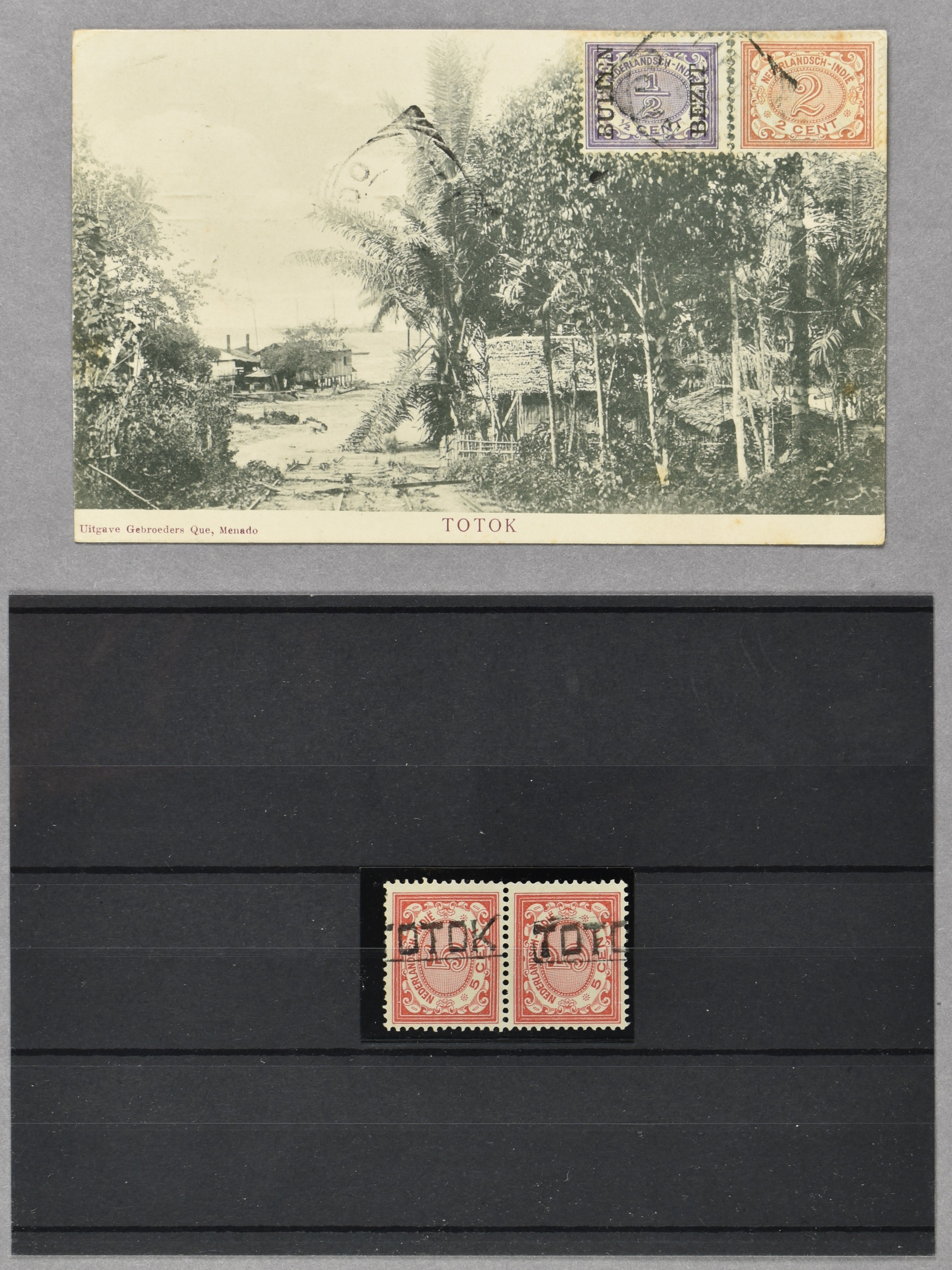 Naamstempel TOTOK (dus geen Ratatotok!) op 5 cent nr. 46. Prachtpaar met op elke zegel een afdruk van dit buitengewoon zeldzame stempel (SvL RR). Tevens bijgevoegd een prentbriefkaart uit 1911 met een afbeelding van Totok