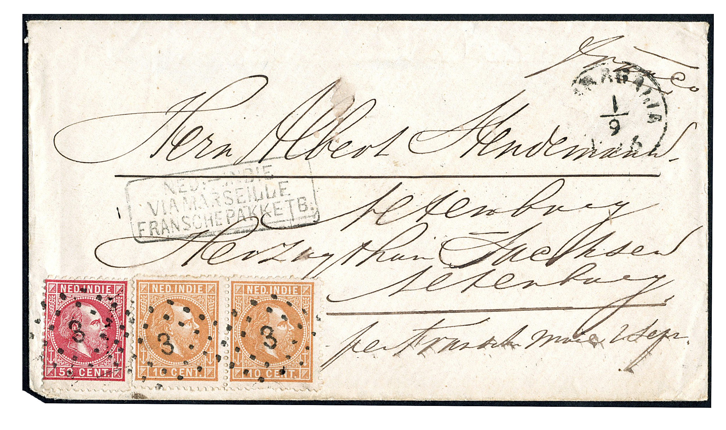 10 Cent nr. 9C in paar en 50 cent nr. 15C met prachtige afdrukken puntstempel 3 op env. van Soerabaija 1-9-1876 met Franse pakketboot via Marseille naar Altenburg (D) 10-10. Brief uit de periode voor de toetreding tot de UPU (Image)