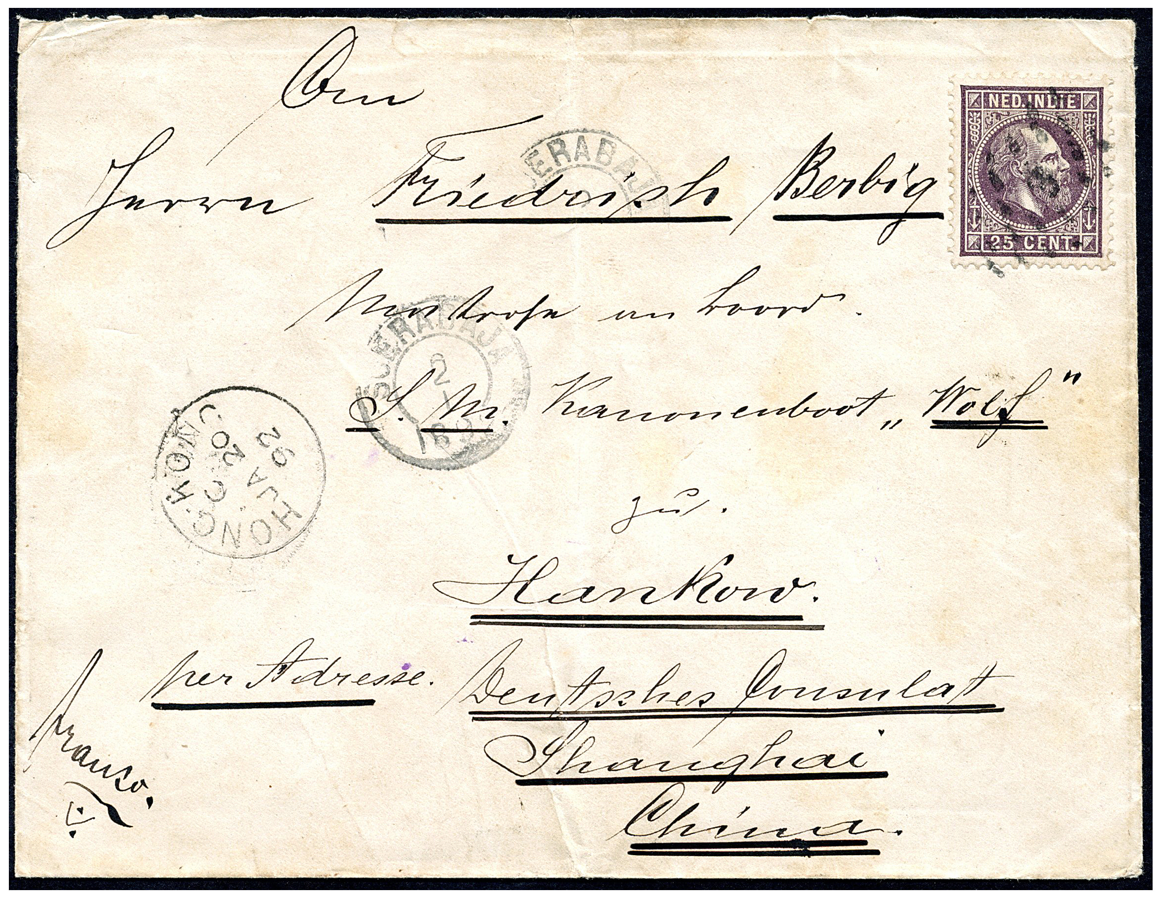 25 Cent nr. 13Fa op envelop van Soerabaja 2-1-1892 naar een opvarende van de Kanonenboot 'Wolf' in Hankow, p/a Deutsches Consulat, Shanghai, verzonden over Weltevreden 5-1 en Hong Kong 20-1 naar Shanghai, az. 2x afgest. in blauw Shanghai
