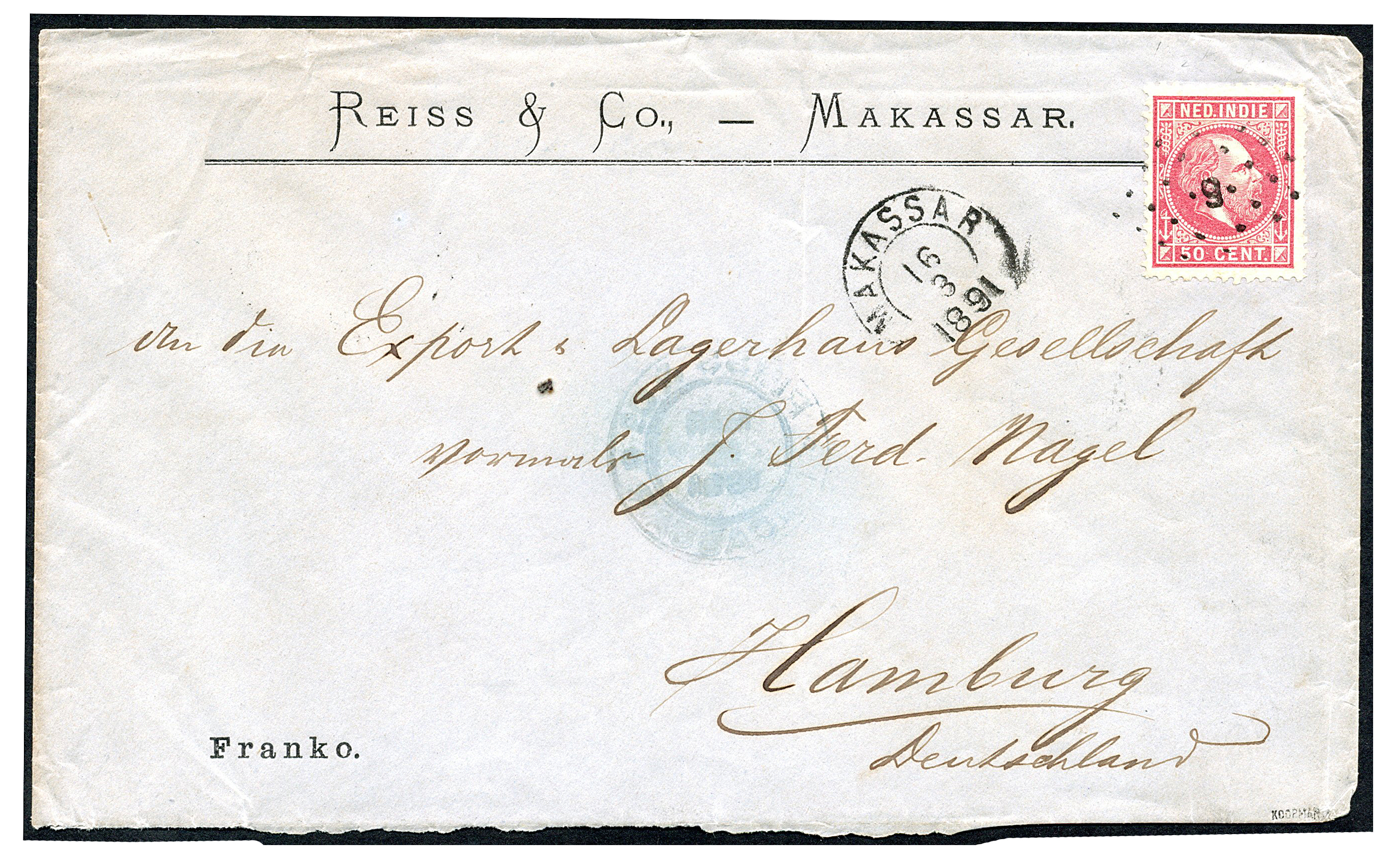 50 Cent nr. 15H als enkelfrankering op firmacouvert (az. blauw afzenderstempel met datum 16-3-1891) van Makassar 16-3-1891 over Weltevreden 23-3 naar Hamburg 26-4. Tarief: 25 cent per 15 gram (zie: NITAR, p.100). Keur Koopman (Image)