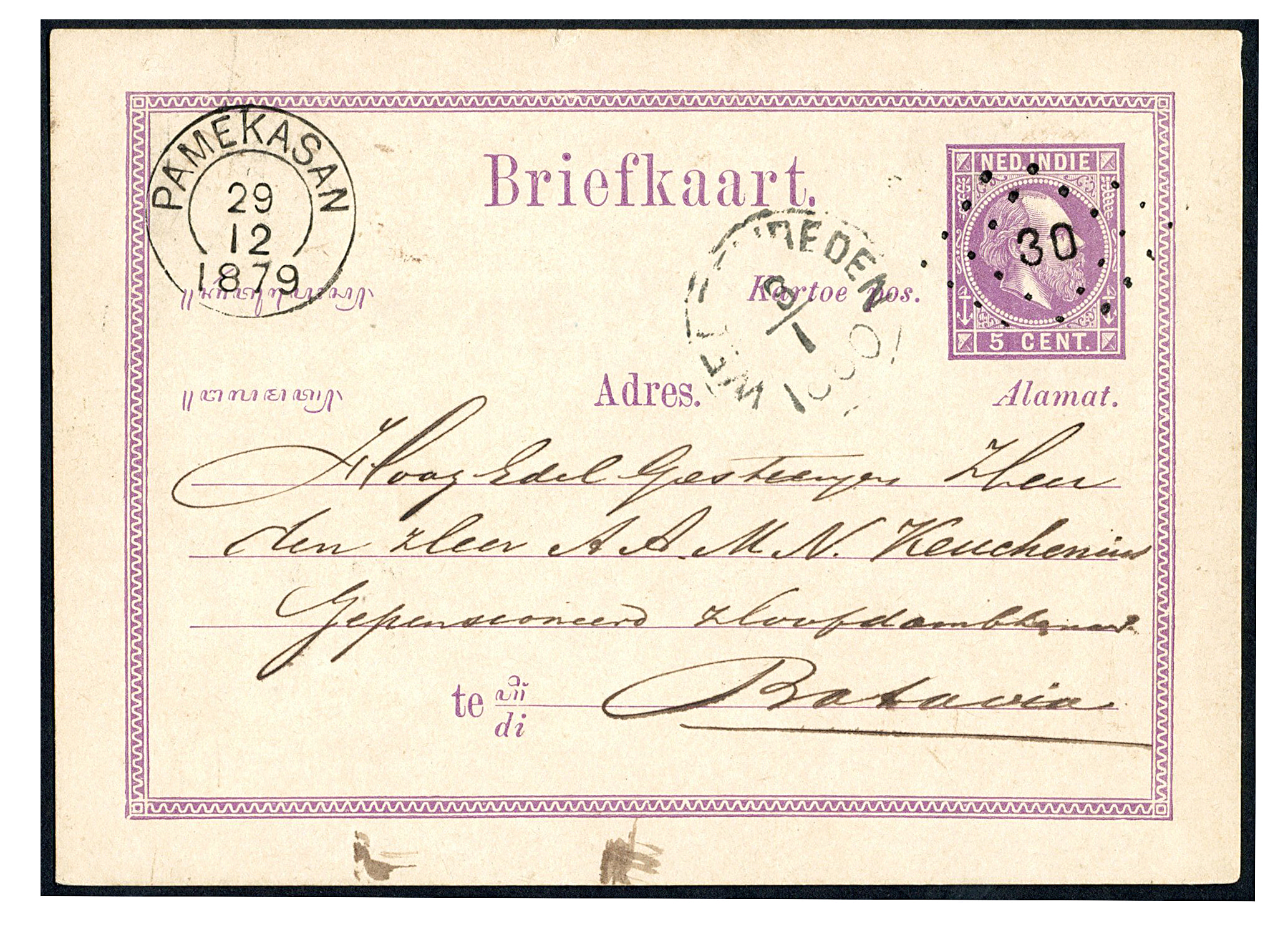 Bk. G1b (linker rand gaatjes van 2 nietjes) PAMAKASSAN 1-1-1877 (rondstempel, punt 30) via Weltevreden 9-1 naar Batavia. Tevens bk. G1c van PAMEKASAN 29-12-1879 (kleinrond, type met 1 S, punt 30) via Weltevreden 3-1-1880 naar Batavia (Image)