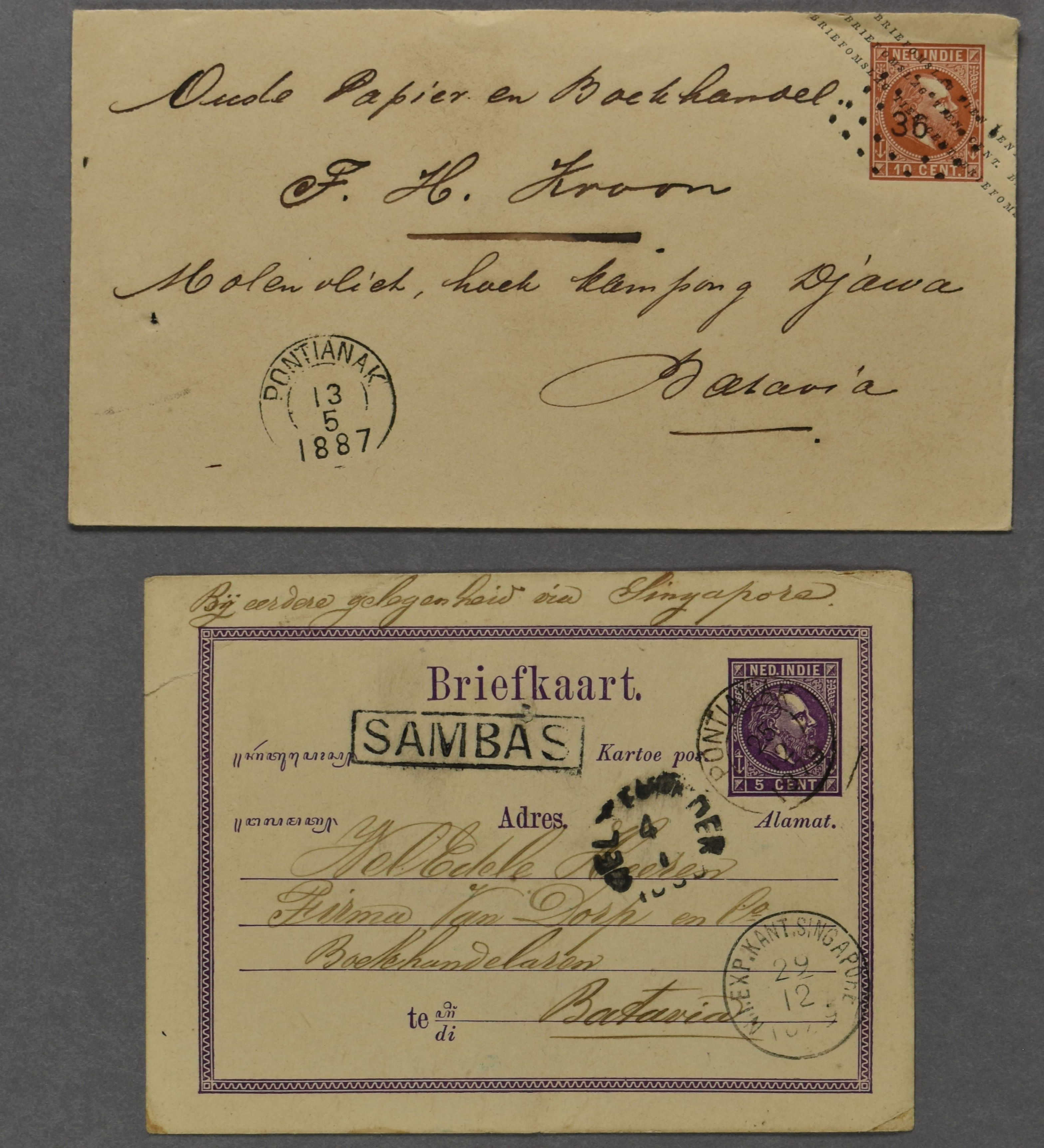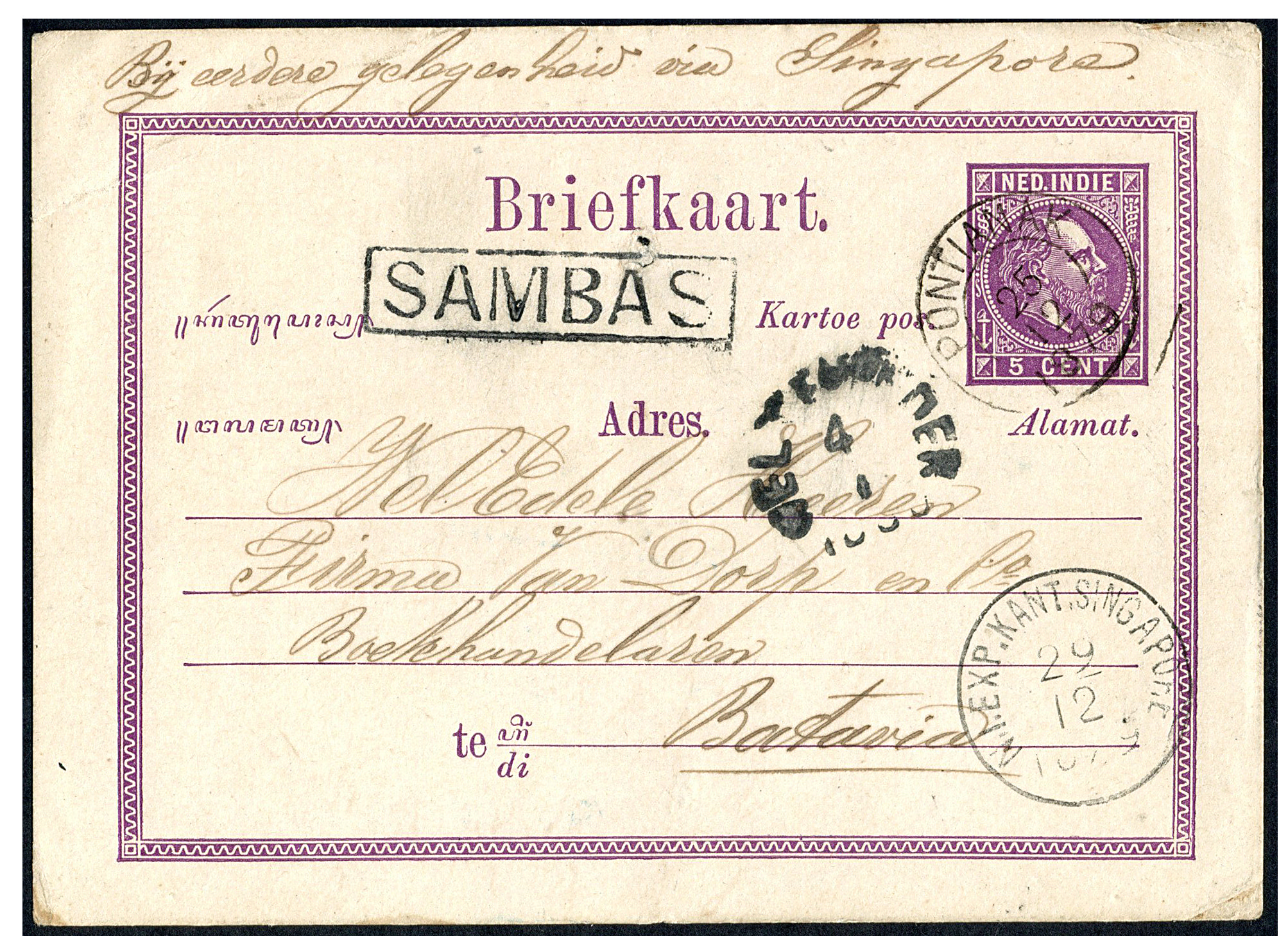 BK. G1a (2 hoekvouwtjes) geschreven te SAMBAS 20-12-1879 (naamstempel) met notitie 'Bij eerdere gelegenheid via Singapore', via Pontianak 23-12 en de N.I.EXP.KANT.SINGAPORE 29-12 over Weltevreden 4-1-1880 naar Batavia. Tevens env. G5 van