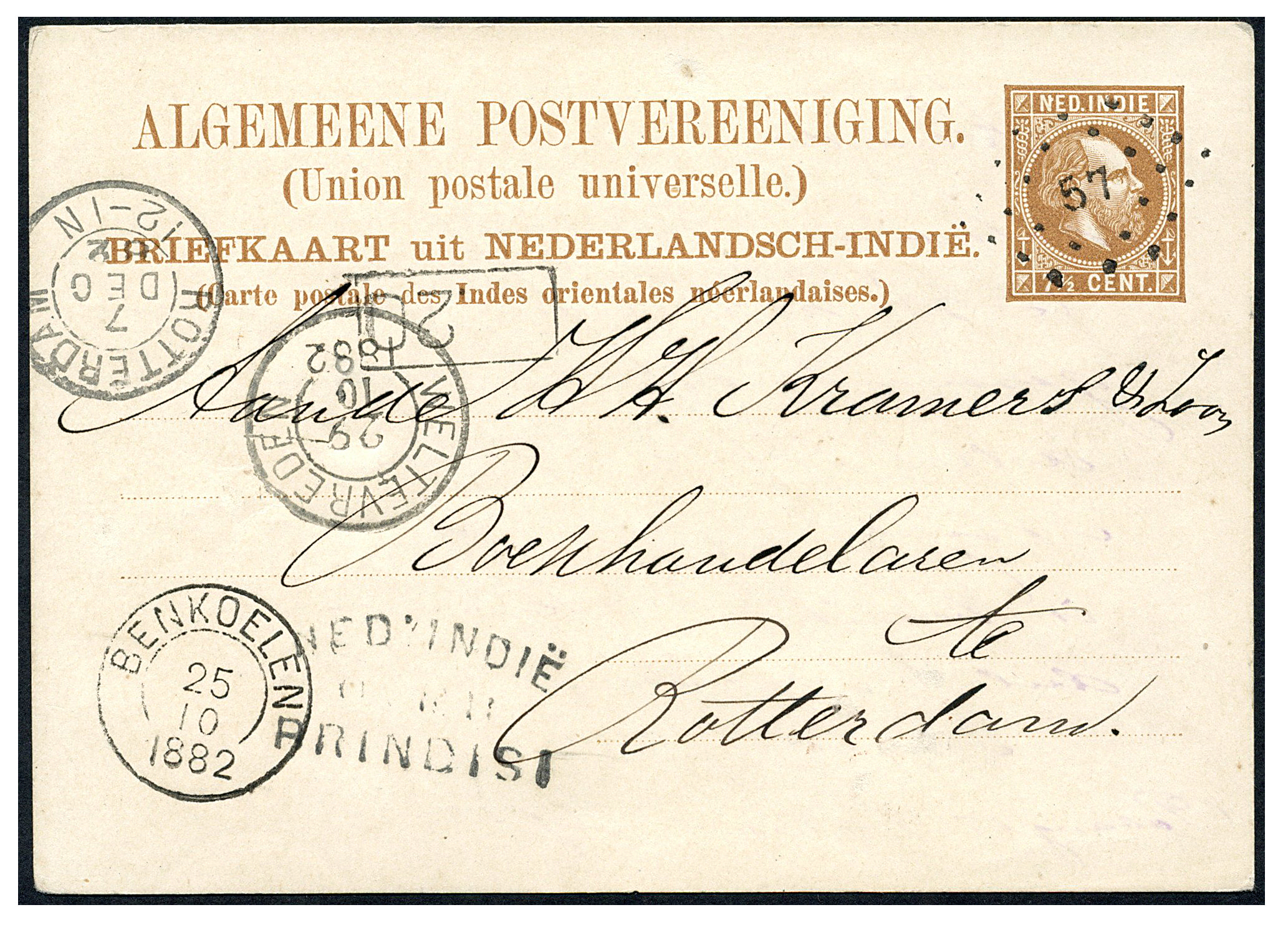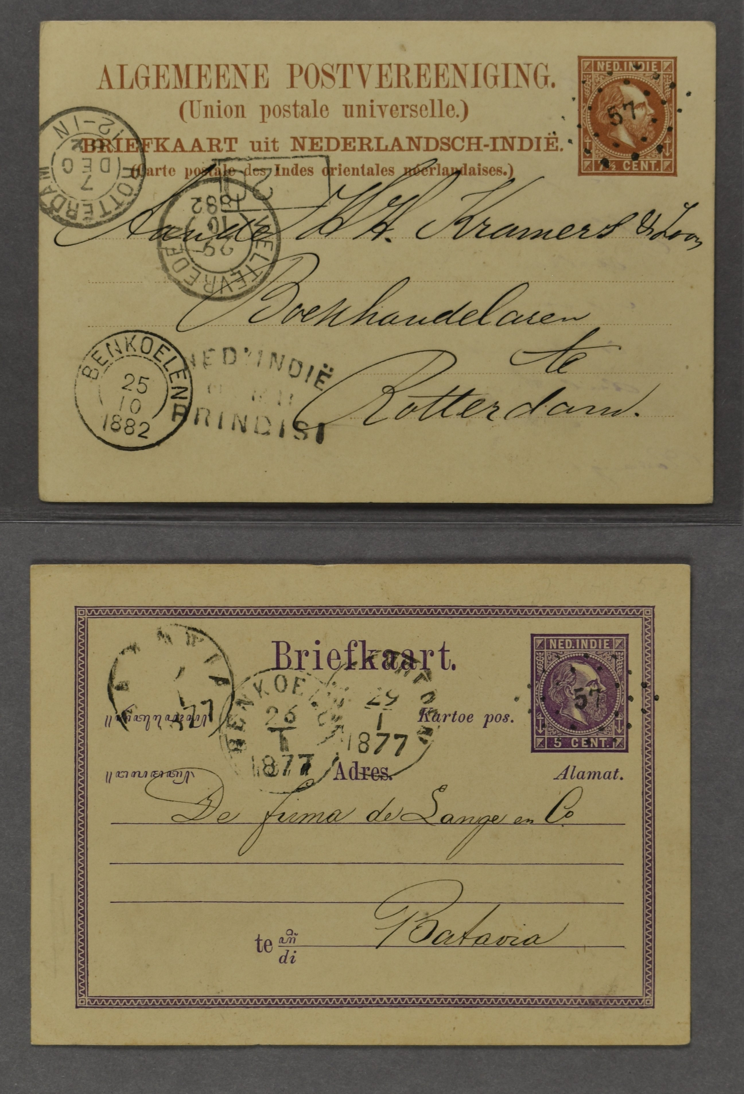 Bk. G1a van BENKOELEN 26-1-1877 (rondstempel in zwartblauw, punt 57) over Weltevreden 29-1 naar Batavia 29-1. Tevens bk. G5 van BENKOELEN 25-10-1882 (kleinrond, punt 57 luxe!) via Weltevreden 29-10 over Brindisi (route) naar Rotterdam