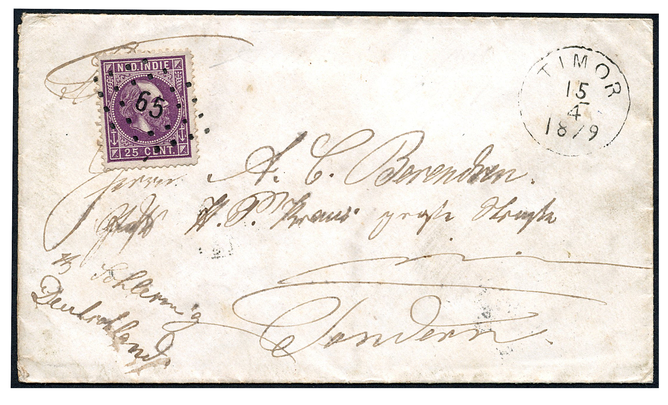 25 Cent nr. 13E met puntstempel 65 (luxe!) op envelop van TIMOR 15-4-1879 (rondstempel) via Napoli 1-6 naar Tondern 5-6 (D) (Image)