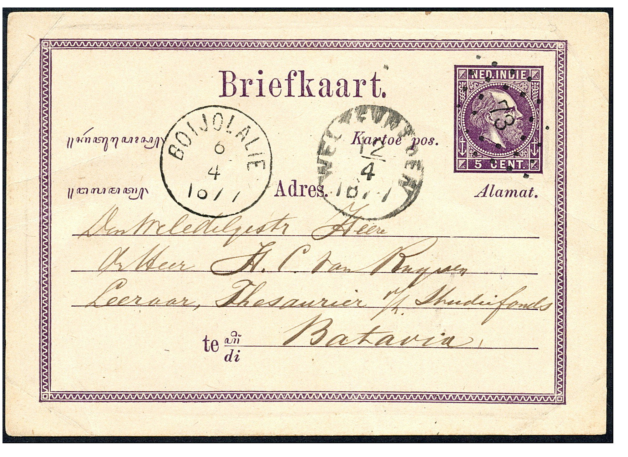 Bk. G1b (vouwtjes) van BOIJOLALIE 6-4-1877 (rondstempel, punt 73 luxe!) over Weltevreden 12-4 naar Batavia. Tevens env. G6 van BOJOLALI 4-4-1887 (kleinrond, punt 73 luxe!) via Soerakarta 4-4 en Weltevreden 7-4 naar Batavia met op az.