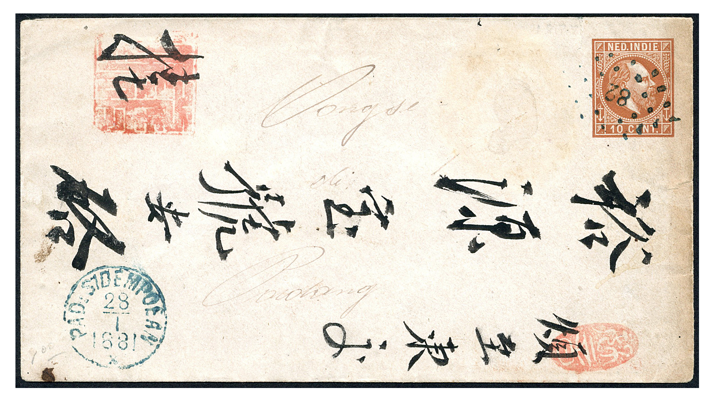 Env. G1 van PAD:SIDEMPOEAN 28-1-1881 (rondstempel en punt 82 in blauw) naar Padang 1-2 (miniem scheurtje, maar decoratief stuk). Tevens env. G6 bijgefr. met 10 cent nr. 9 van PADANG SIDEMPOEAN 12-6-1893 (vierkant, 2 prachtige afst.)