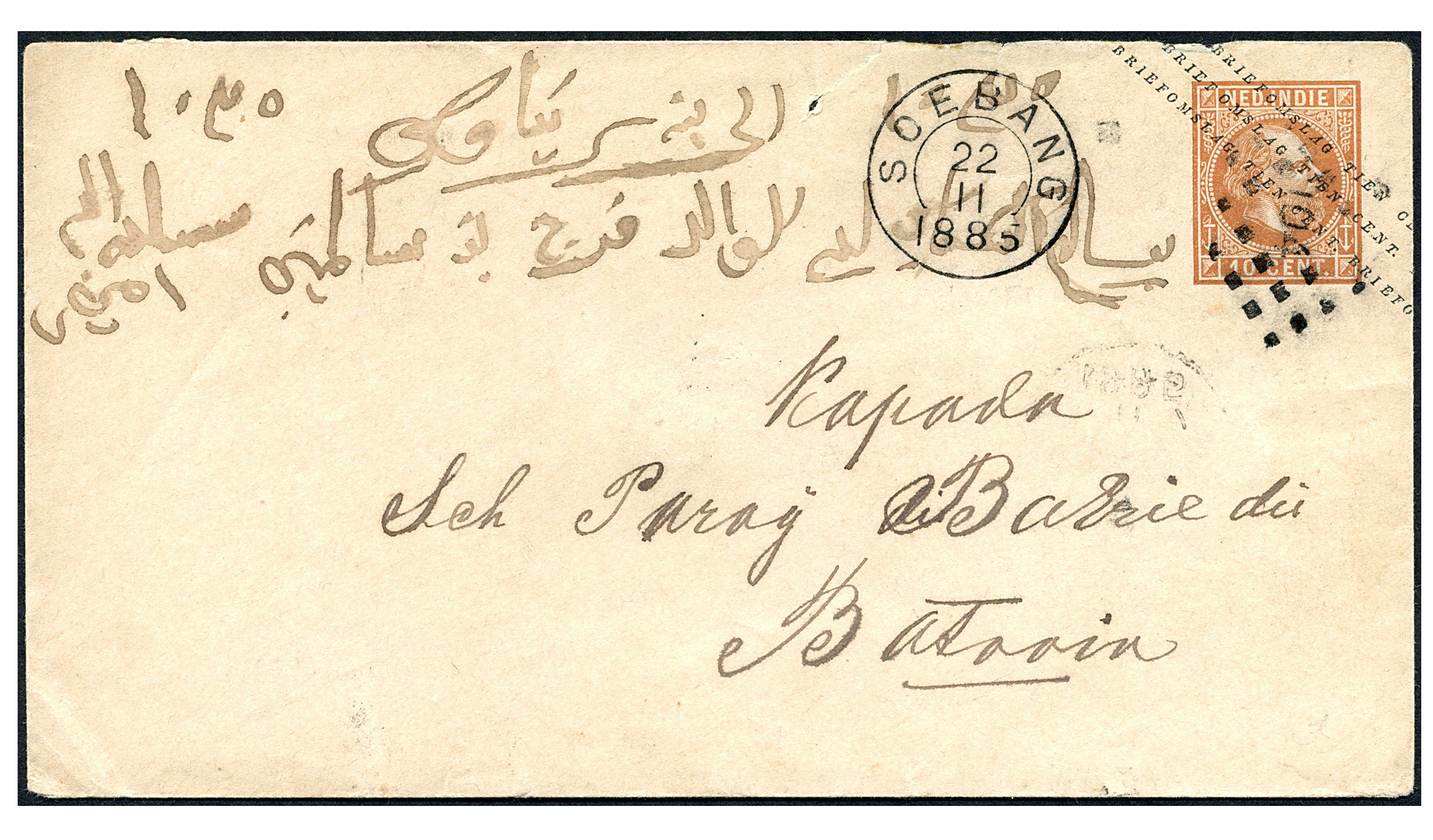 Env. G5 (min. scheurtje, klep ontbreekt) van SOEBANG 22-11-1885 (kleinrond, punt 104, beide ideale afst.!) over Poerwakarta 22-11 en Weltevreden 24-11 naar Batavia 24-11. Zeldzaam op poststuk en zeker in deze kwaliteit! (Image)