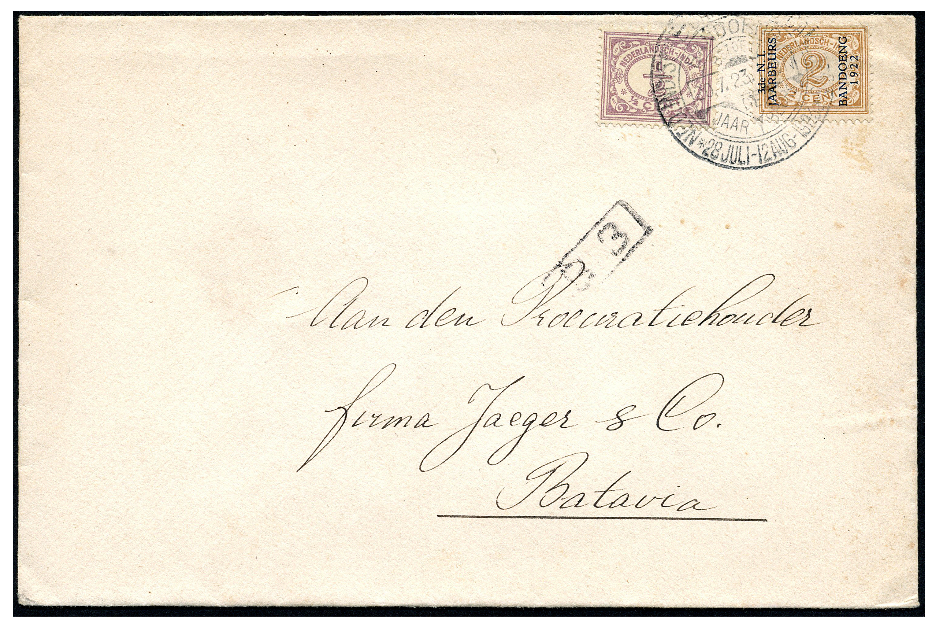 Cent Jaarbeurs Bandoeng nr. 150 en ½ cent nr. 99 op open envelop van Bandoeng 20-7-1923 (propagandastempel voor de jaarbeurs 1923) naar Batavia 21-7. Jaarbeurszegels zijn zeer schaars op poststuk! (Image)