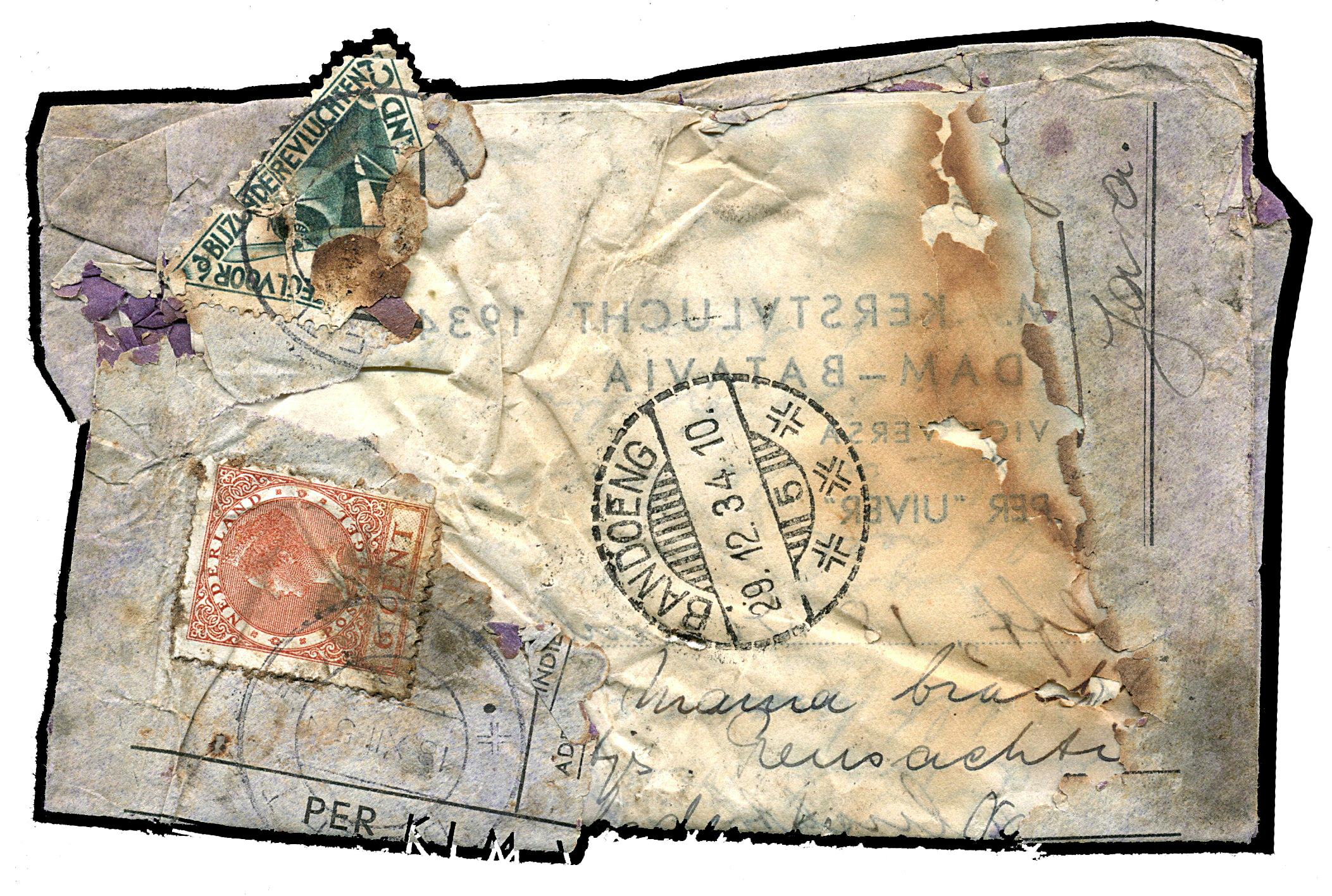 Rampvlucht van de Uiver. Deels verbrande en verwrongen envelop met plakkende inhoud, verzonden in dienstenvelop uit Bandoeng 29-12-1934 naar Delft met violet stempel 'UITREIKEN ZONDER PORTHEFFING' en bijgesloten gestencild briefje.