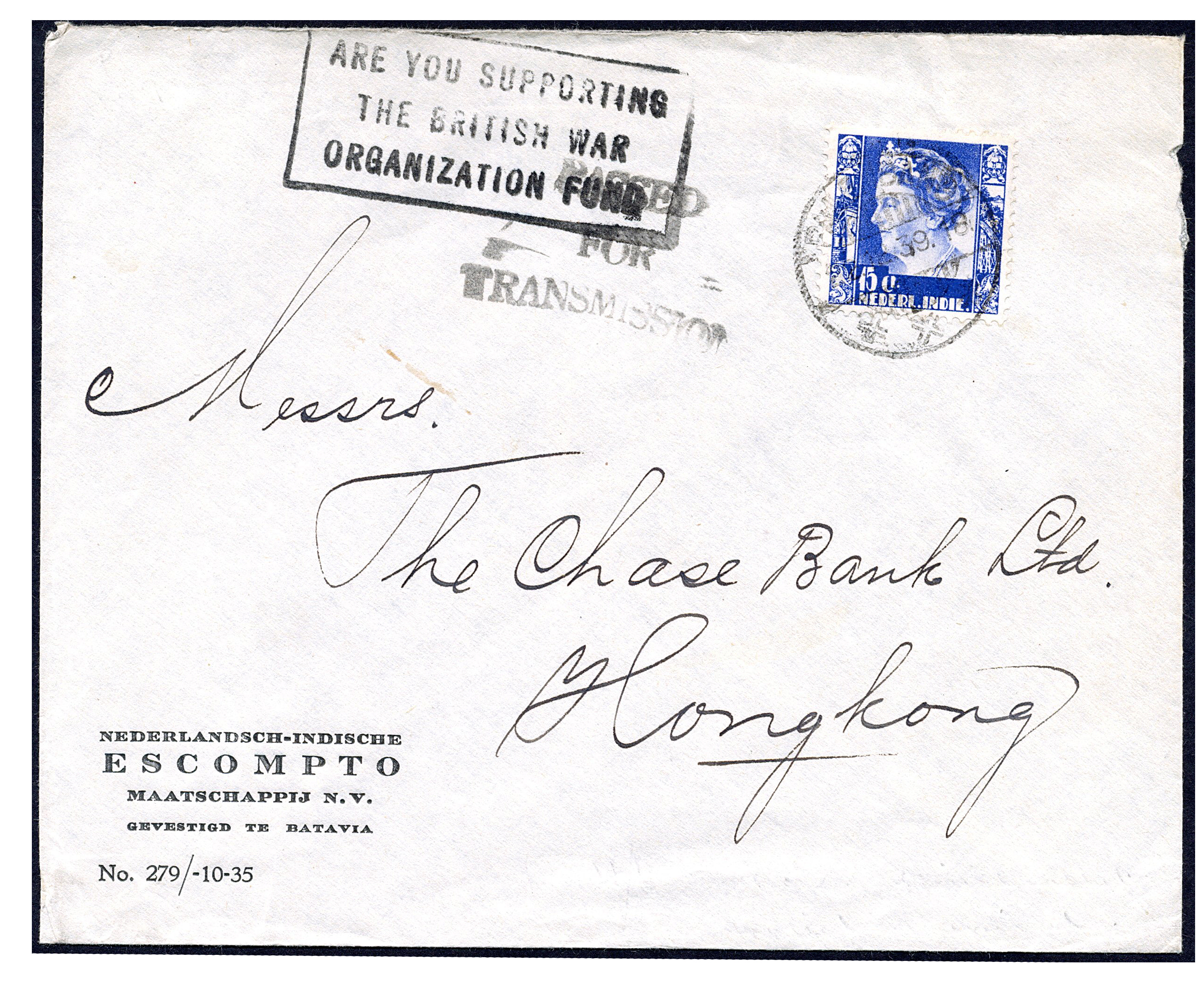 Firma-envelop gefr. met 15 cent van Palembang 22-12-1929 naar Hong Kong met op vz. censuurstempel 'Passed / for / Transmission' en propagandastempel 'ARE YOU SUPPORTING / THE BRITISH WAR / ORGANIZATION FUND'. Door ons nog niet eerder