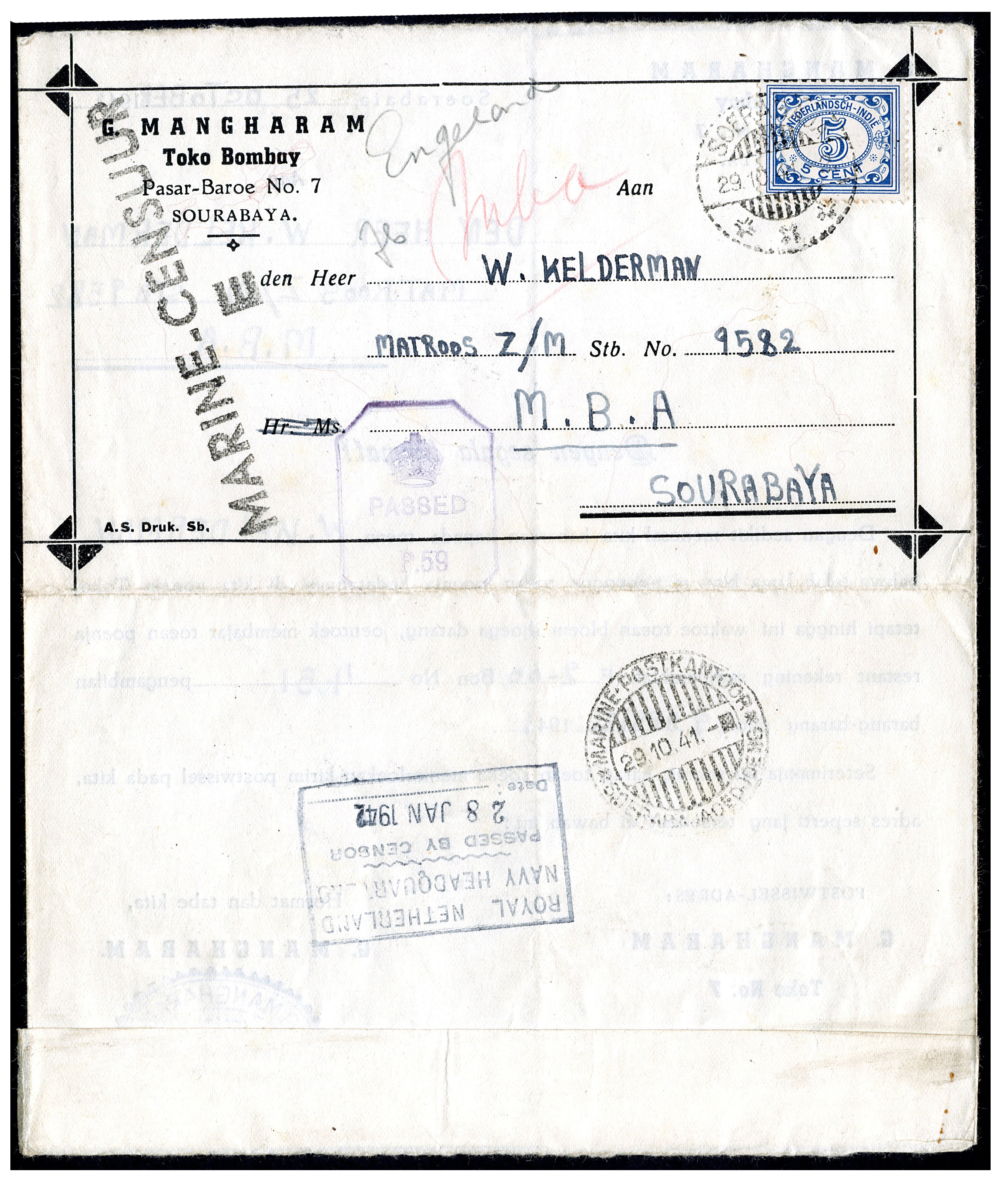Cent Cijfer als lokaal tarief op deels gedrukte brief van Soerabaja 29-10-1941 naar een matroos, met diverse marine-censuurstempels, op az. Marine-Postkantoor 29-10 en rechthoekig censuurstempel 'Royal Netherland / Navy Headquarters / Passed by