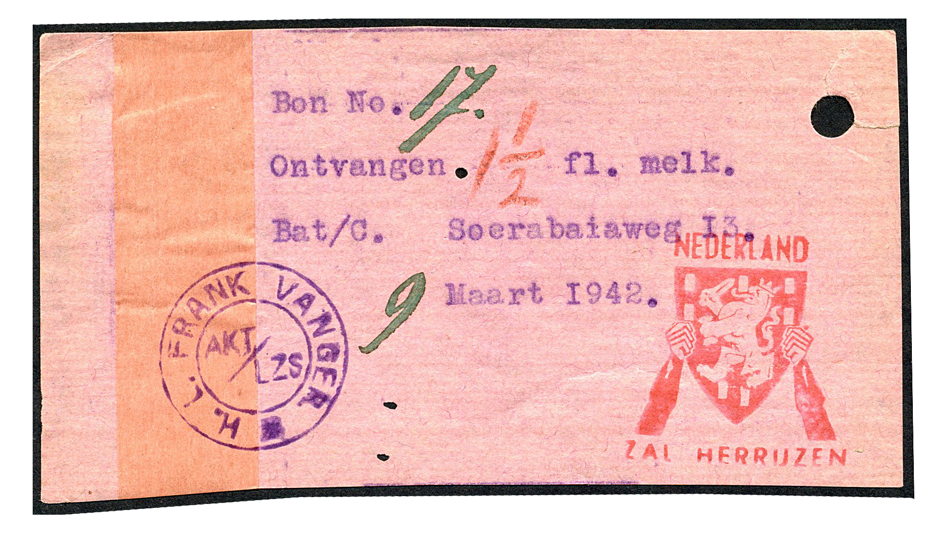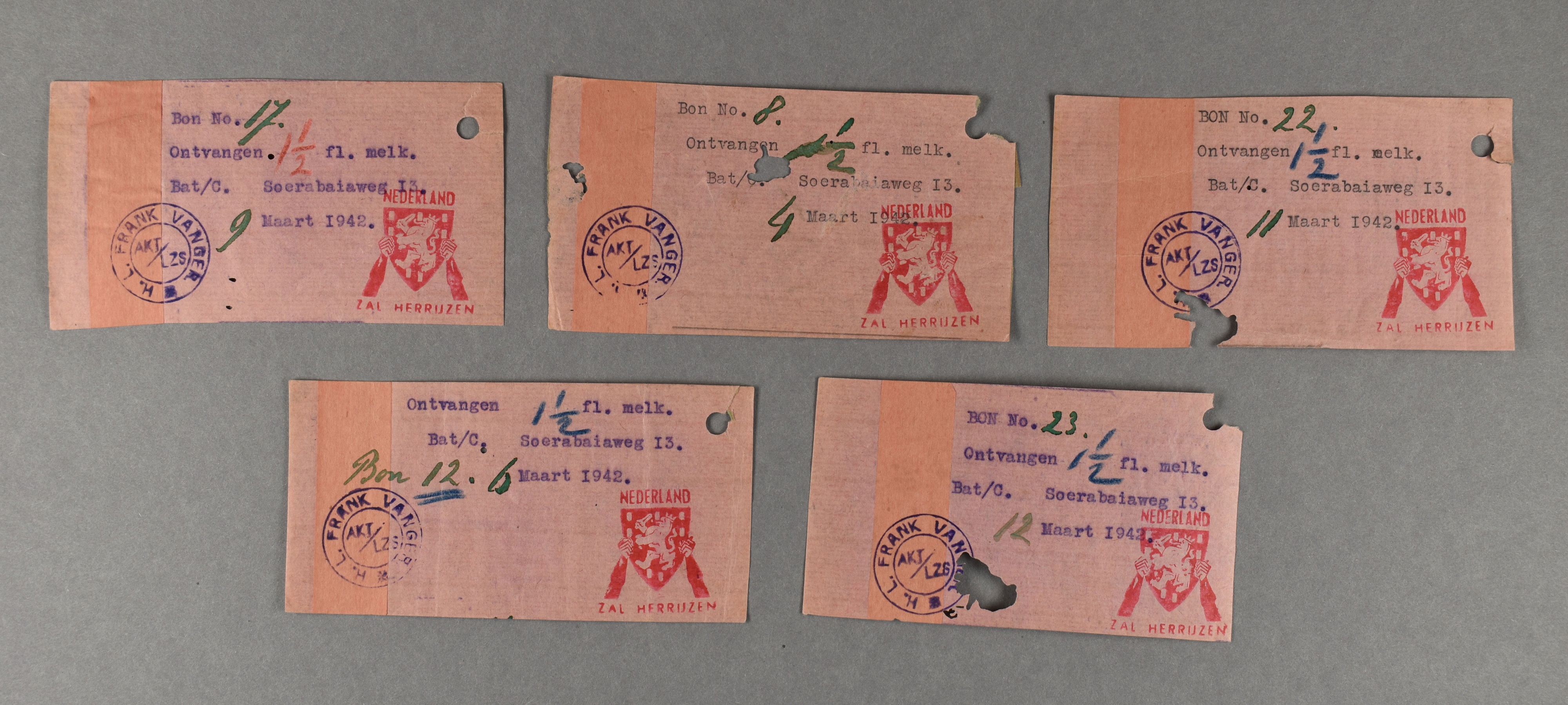 Diversen. Vijf rozekleurige coupons goed voor het ontvangen van 1½ fles melk in Batavia-Centrum 4, 6, 9, 11 en 12 maart 1942 (de dagen dat Japan Java aanviel en het begin van de bezetting), met rode afstempeling van het sedert 10 mei 1940