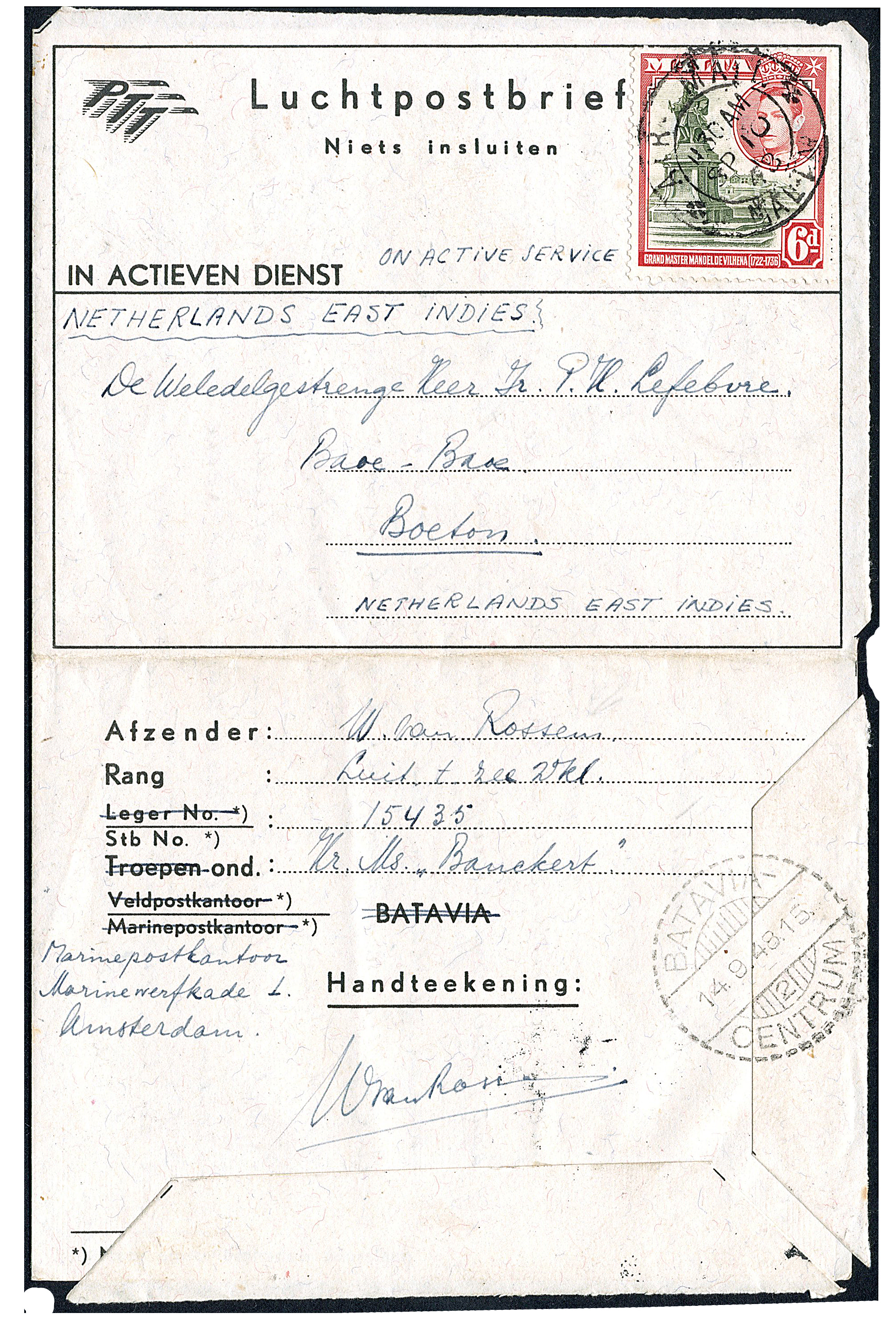 Militair luchtpostblad G1 geschreven 'Hr.Ms. "Banckert" voor Malta, 9 September 1948', voorzien van een zegel van 6d SG.225 afgest. Air Mail / Malta op 10-9-1948, van Wim naar Oom Piet via Batavia-/Centrum 14-9-1948 naar Baoe Baoe op het