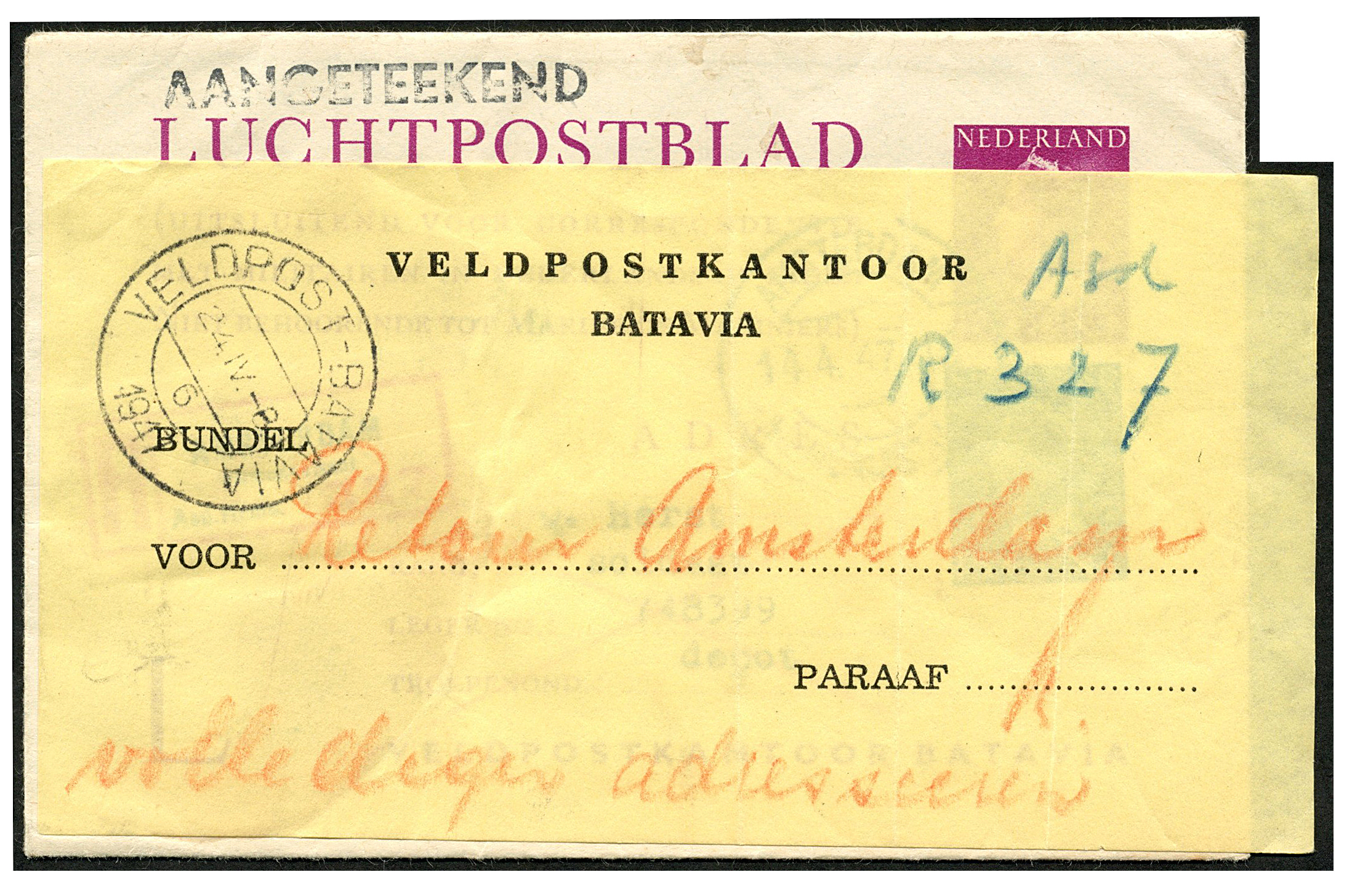 Nederlands luchtpostblad G1a (geen tekst) bijgefr. met 15 cent nr. 337 van Amsterdam / Hemonijstr. 1 14-4-1947 aangetekend naar een soldaat met als adres 'depot', via Batravia / Centrum 19-4 (Bu. NO7b) door het veldpostkantoor Batavia