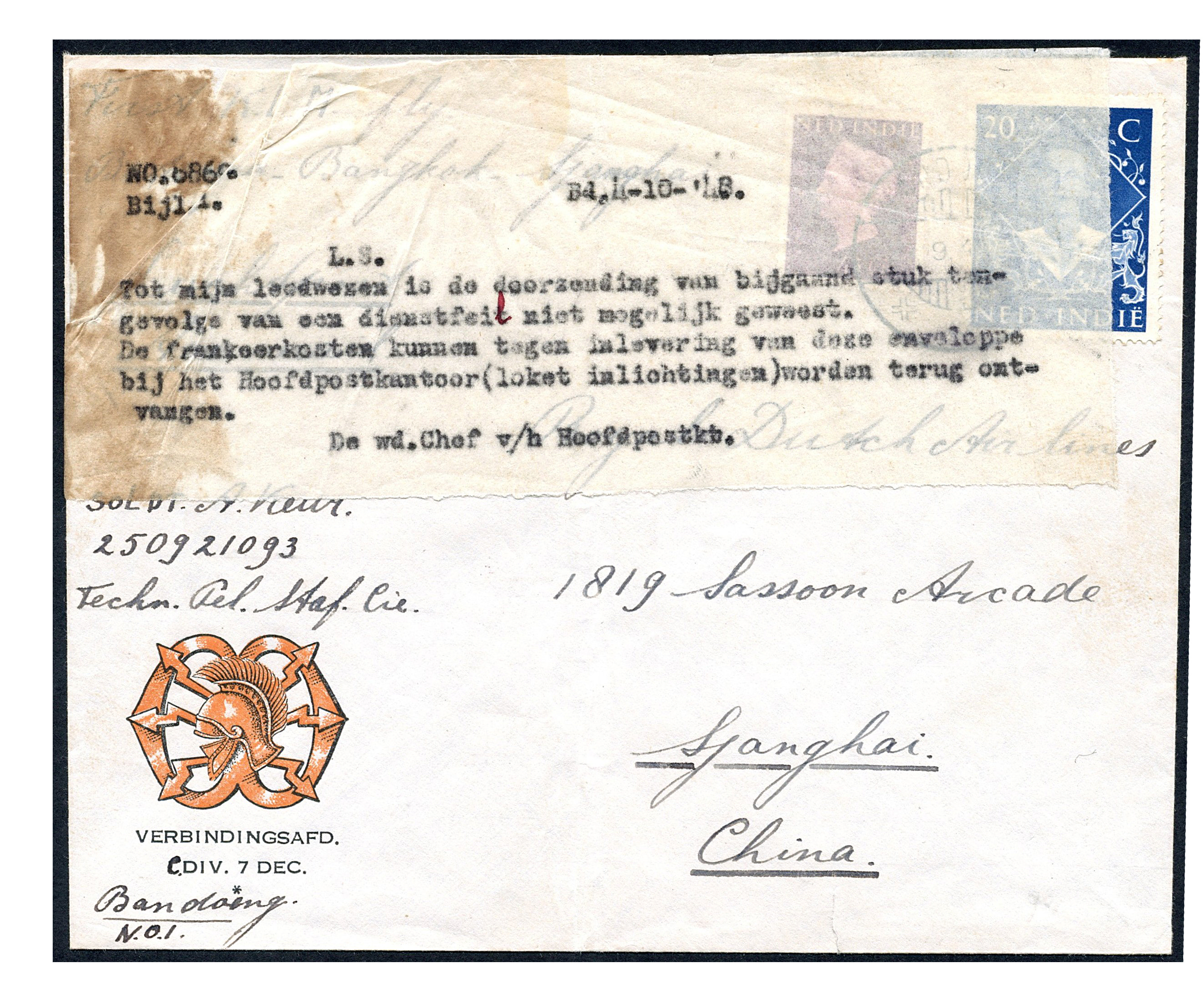 Militaire envelop gefr. met nrs. 341 en 350 van Bandoeng 29-9-1948 met bestemming Shanghai, voorzien van label met tekst dat door dienstfeil de doorzending niet mogelijk was, portkosten kunnen worden teruggevraagd (Image)
