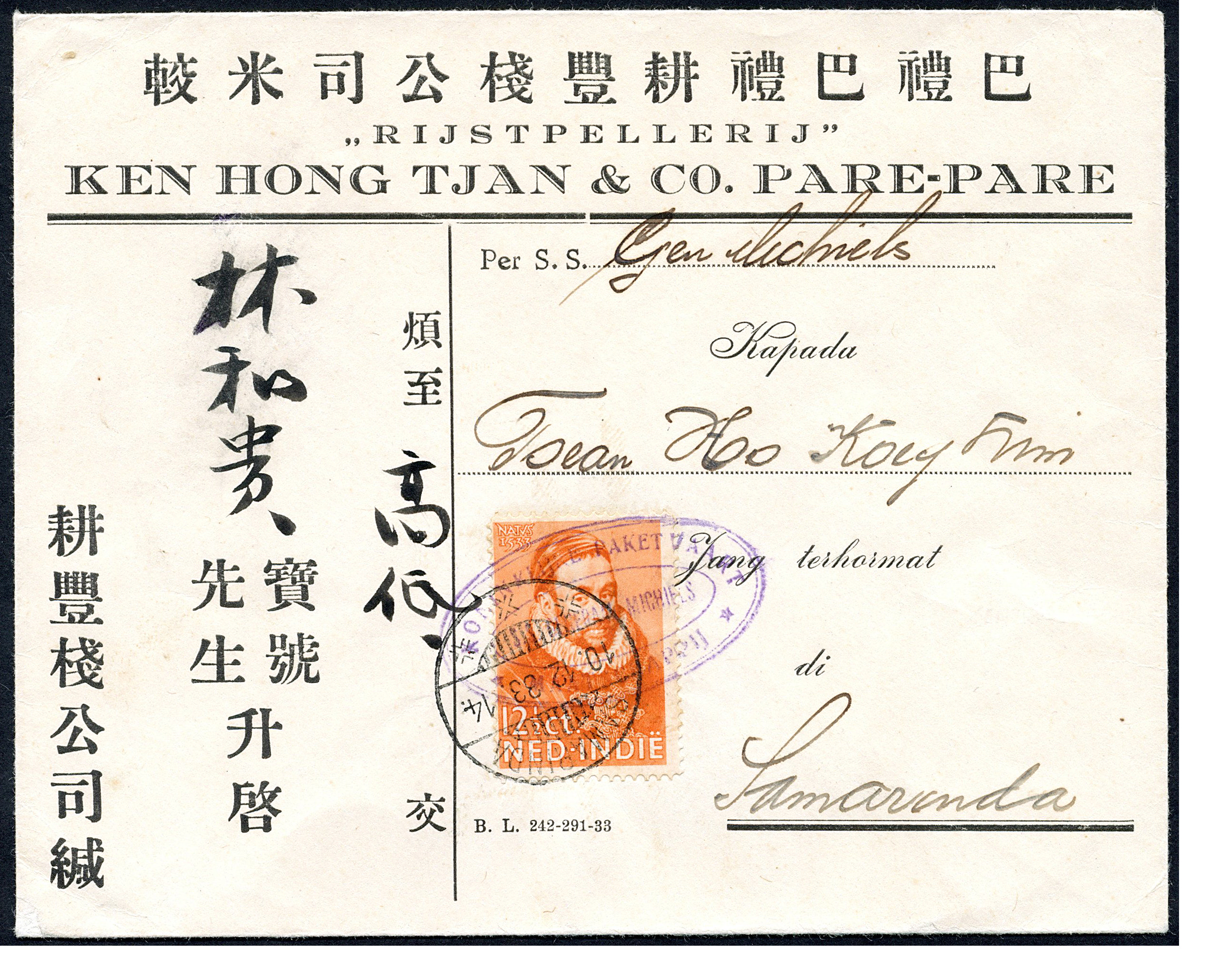 KPM. Mooi firma-couvert uit Toli Toli gefr. met 12½ cent nr. 180, afgest. met KPM-naamstempel 'S.S. van IMHOFF', naar Makasser 2-9-1933 (Image)