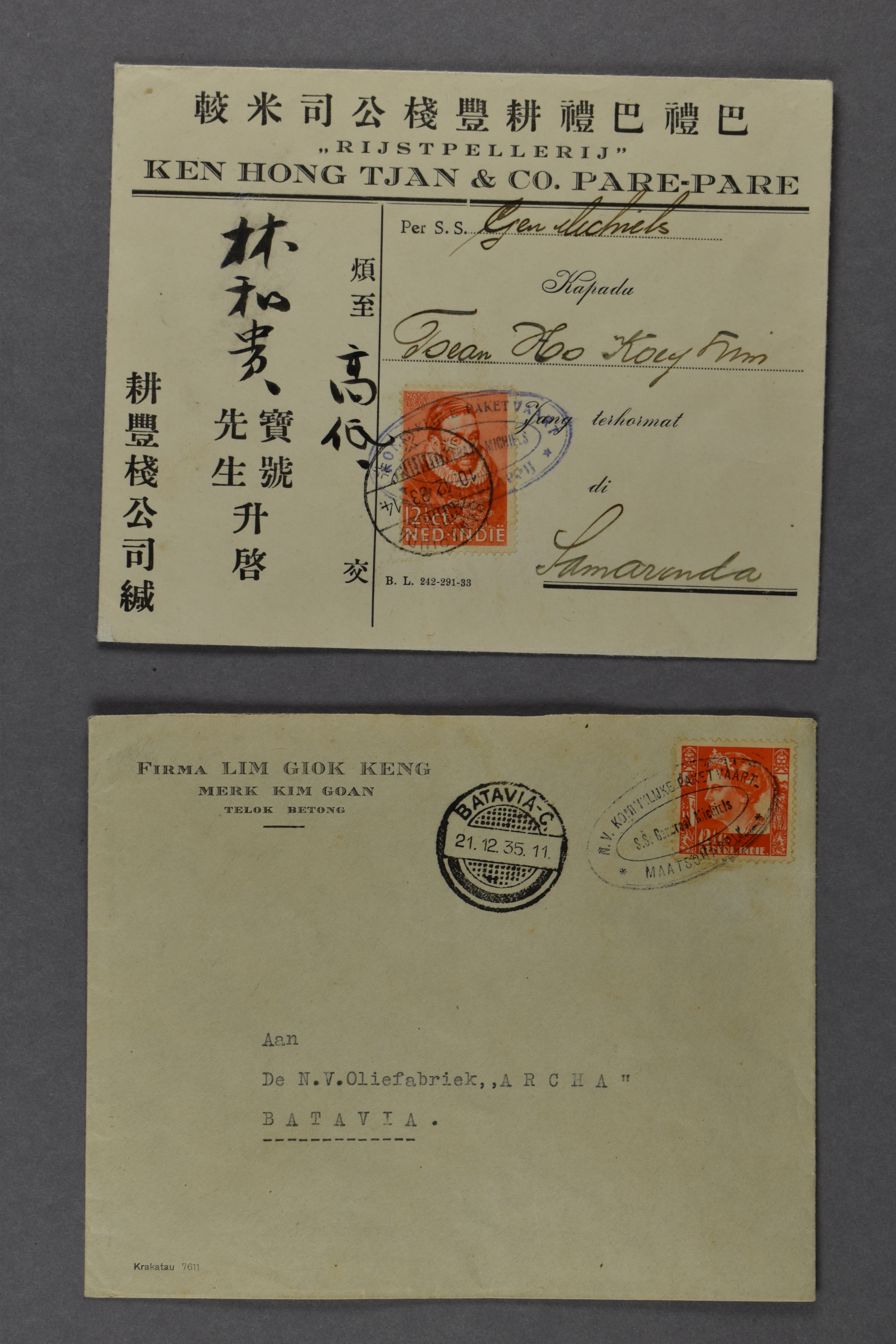 KPM. Twee prachtige firma-enveloppen gefr. met 12½ cent nr. 180 resp. 12½ cent Kreisler, afgest. met KPM-ovaalstempel 'S.S. GENERAAL MICHIELS' naar Samarinda 10-12-1933 resp. 'S.S. Generaal Michiels' naar Batavia-C. 21-12-1935 (Image) (Image2)