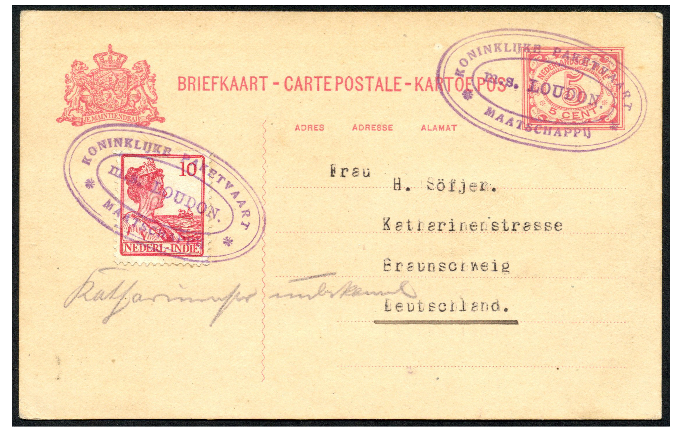 KPM. Bk. G23 bijgefr. met 10 cent, op 23-1-1920 geschreven te Bandjermasin, afgest. met KPM-ovaalstempel 'm.s. LOUDON.', naar Braunschweig (Image)