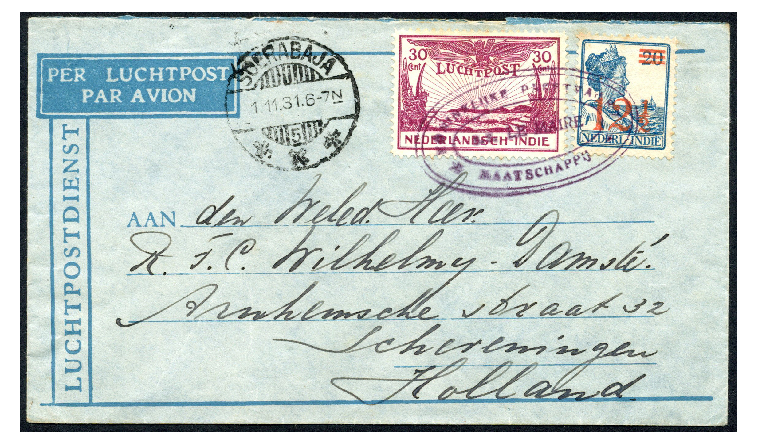 KPM. 12½ cent en 30 cent luchtpost op envelop afgest. met KPM-ovaalstempel 's.s. LE MAIRE', via Soerabaja 1-11-1931 naar Scheveningen (Image)