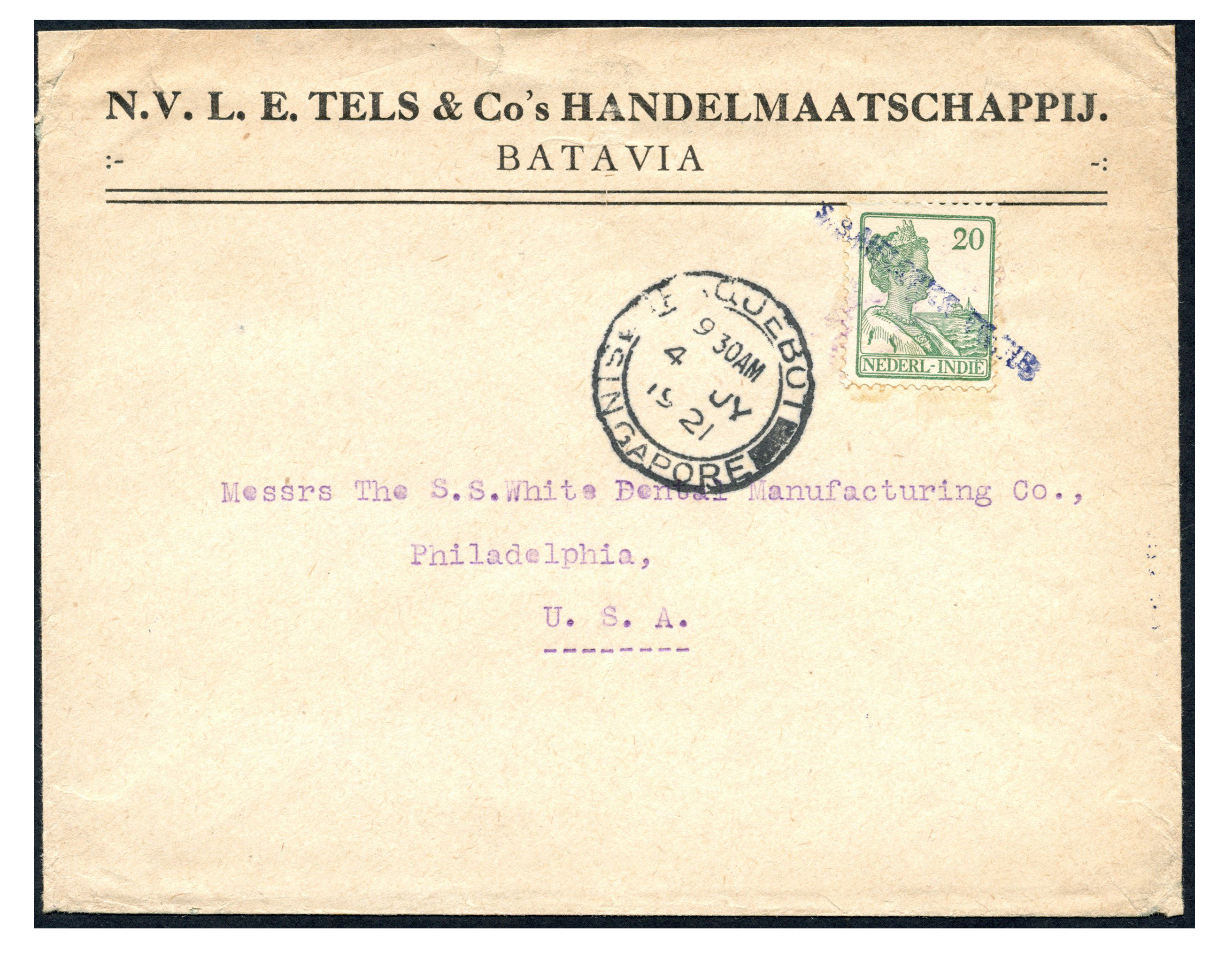 KPM. 20 Cent nr. 120 op firma-envelop uit Batavia, in blauw wat onduidelijk afgest. met KPM-naamstempel 's.s. MELCHIOR TREUB' met op vz. 'Paquebot Singapore 4-7-1921' naar de USA. Tevens env. gefr. met nrs. 113 en 142 in blauwzwart