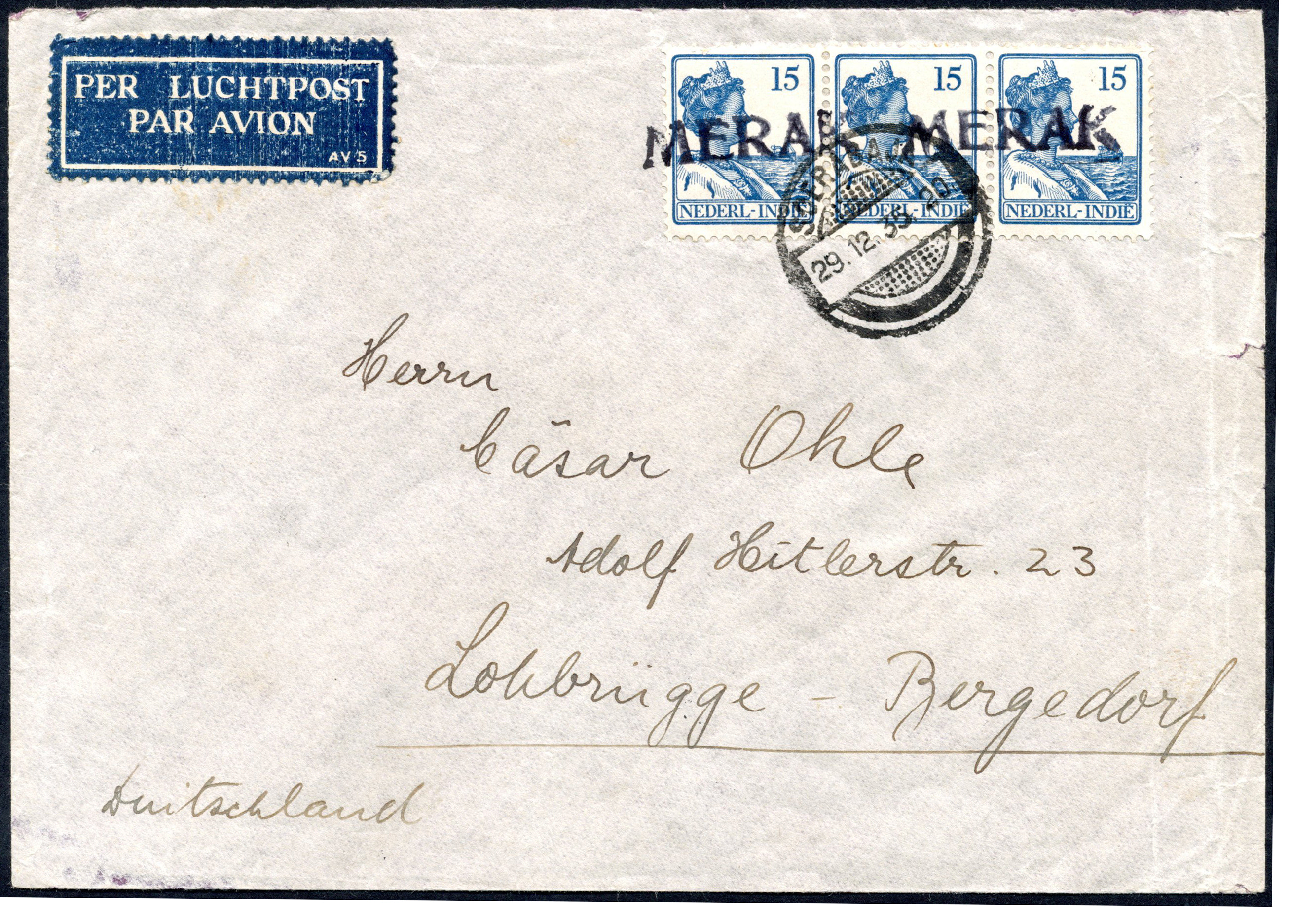 KPM. 15 Cent in strip van 3 op env. uit Samarinda, in violetzwart 2x afgest. met KPM-naamstempel 'MERAK', over Soerabaja 29-12-1935 naar Duitsland