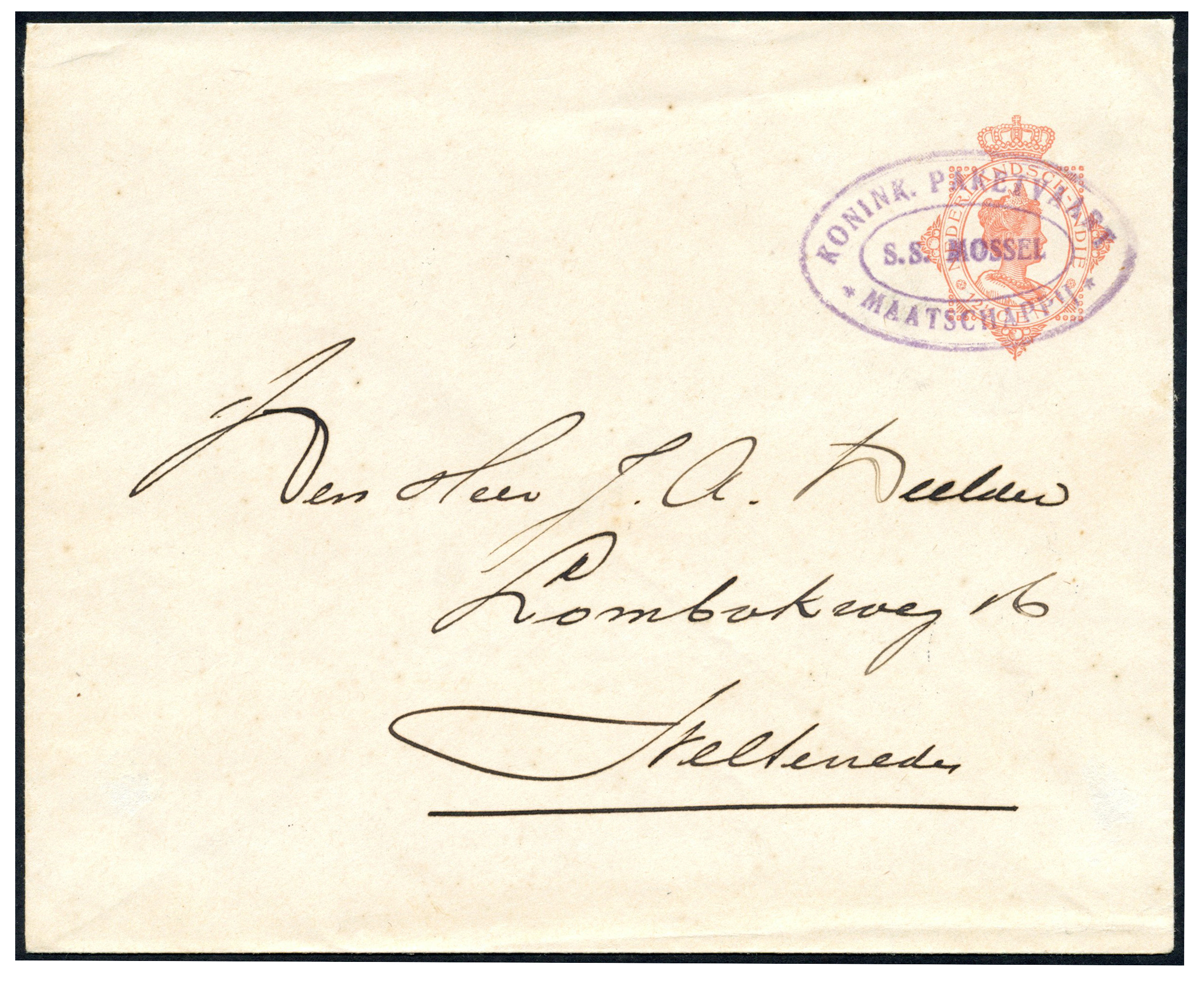 KPM. Env. G47 afgest. met KPM-ovaalstempel 'S.S. MOSSEL' over Singapore met op az. 'Paquebot / Singapore' 27-3-1928 naar Weltevreden 30-3-1928