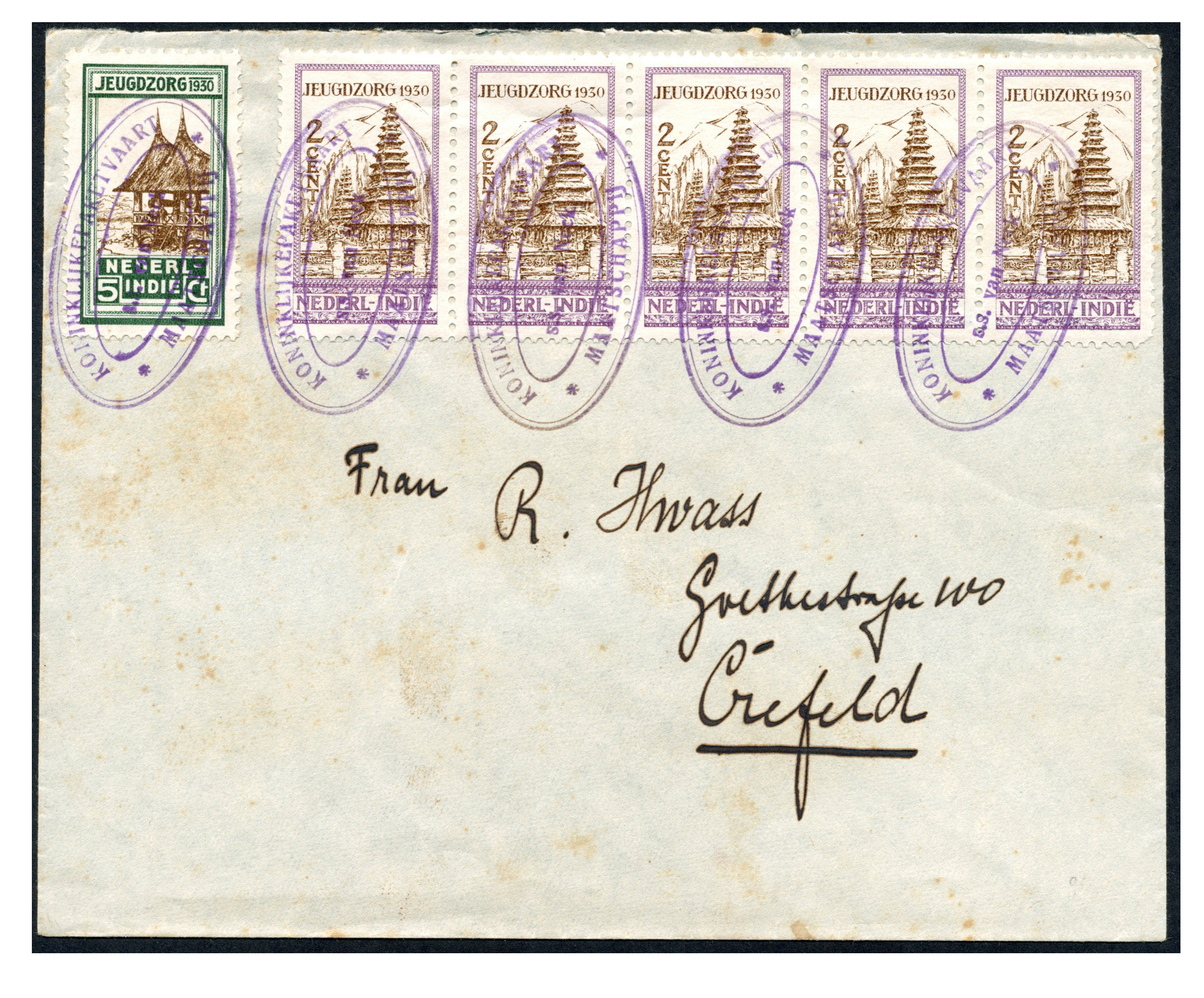 KPM. Jeugdzorg 1930 2 cent in strip van 5 en 5 cent op iets getinte, ongedateerde envelop uit Singkel (Sumatra), 5x afgest. met KPM-ovaalstempel 's.s. van Neck', naar Duitsland (Image)
