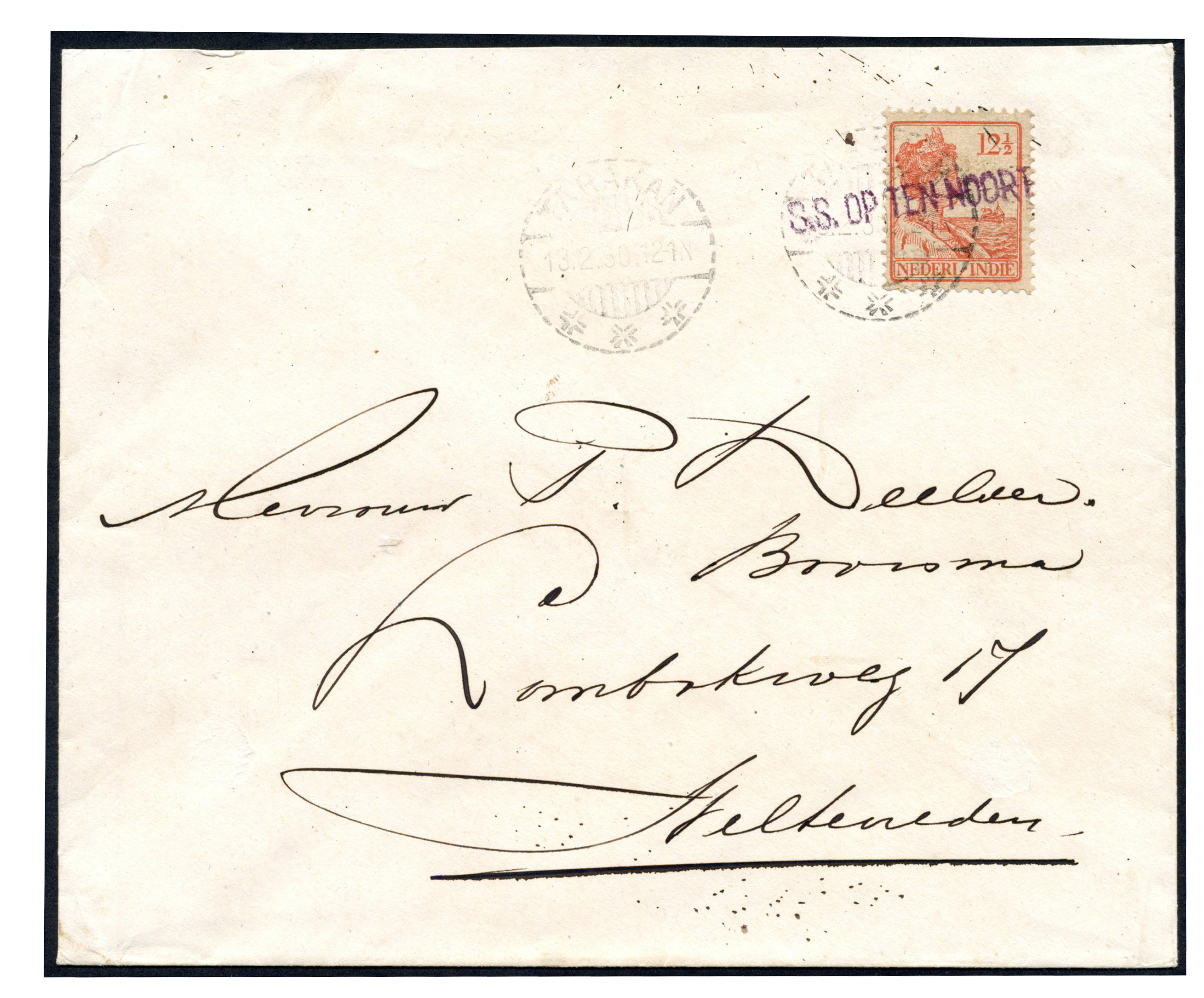KPM. 12½ cent op KPM-envelop, afgest. met KPM-naamstempel 'S.S. OP TEN NOORT' via Tarakan 13-2-1930 naar Weltevreden 24-2 (Image)
