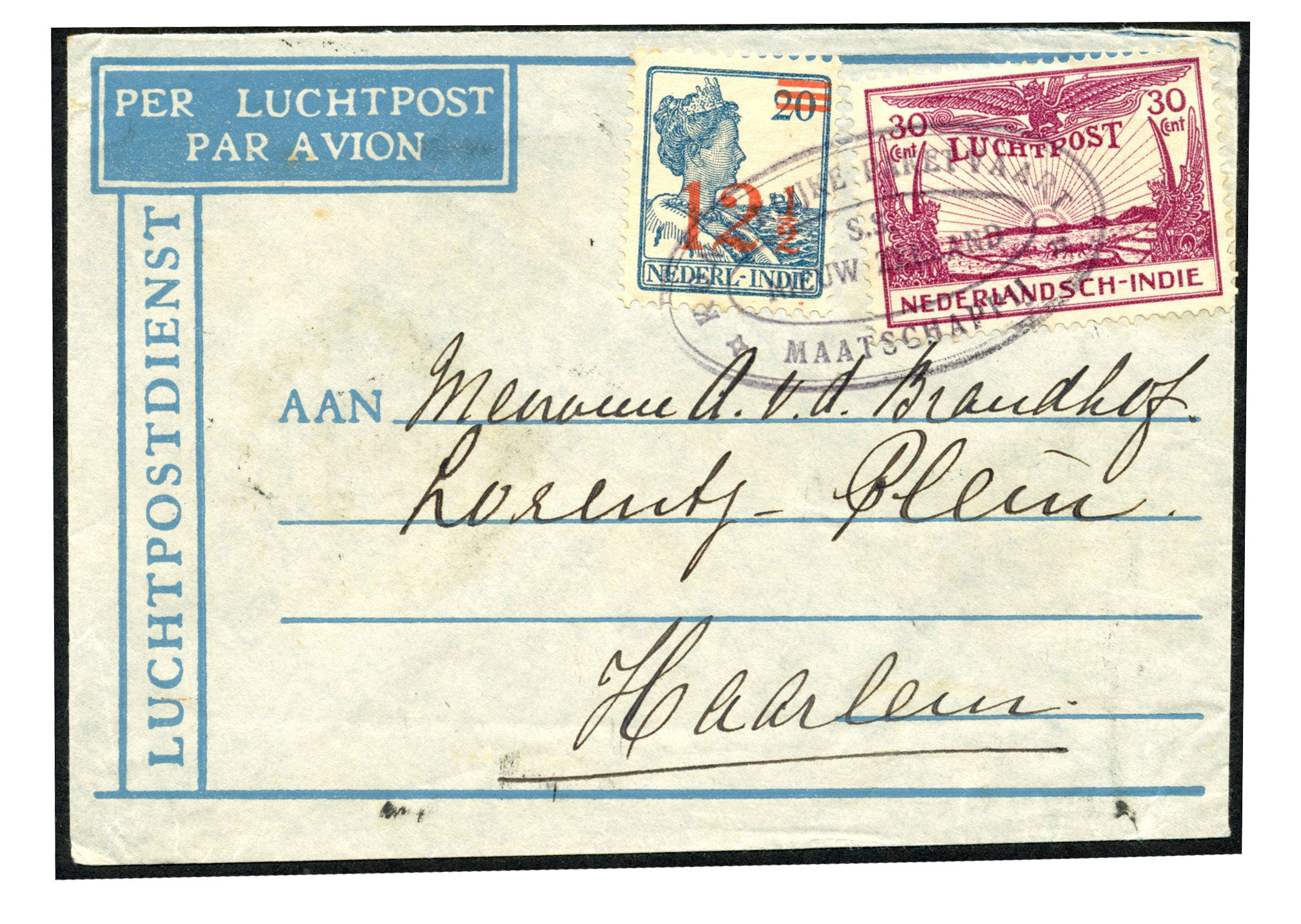 KPM. 2½ cent in paar en 3x 12½ cent Kreisler op env. afgest. met KPM-ovaalstempel 's.s. v.d. LIJN', via (ongebruikelijk) Cheribon 9-8-1935 naar Baarn