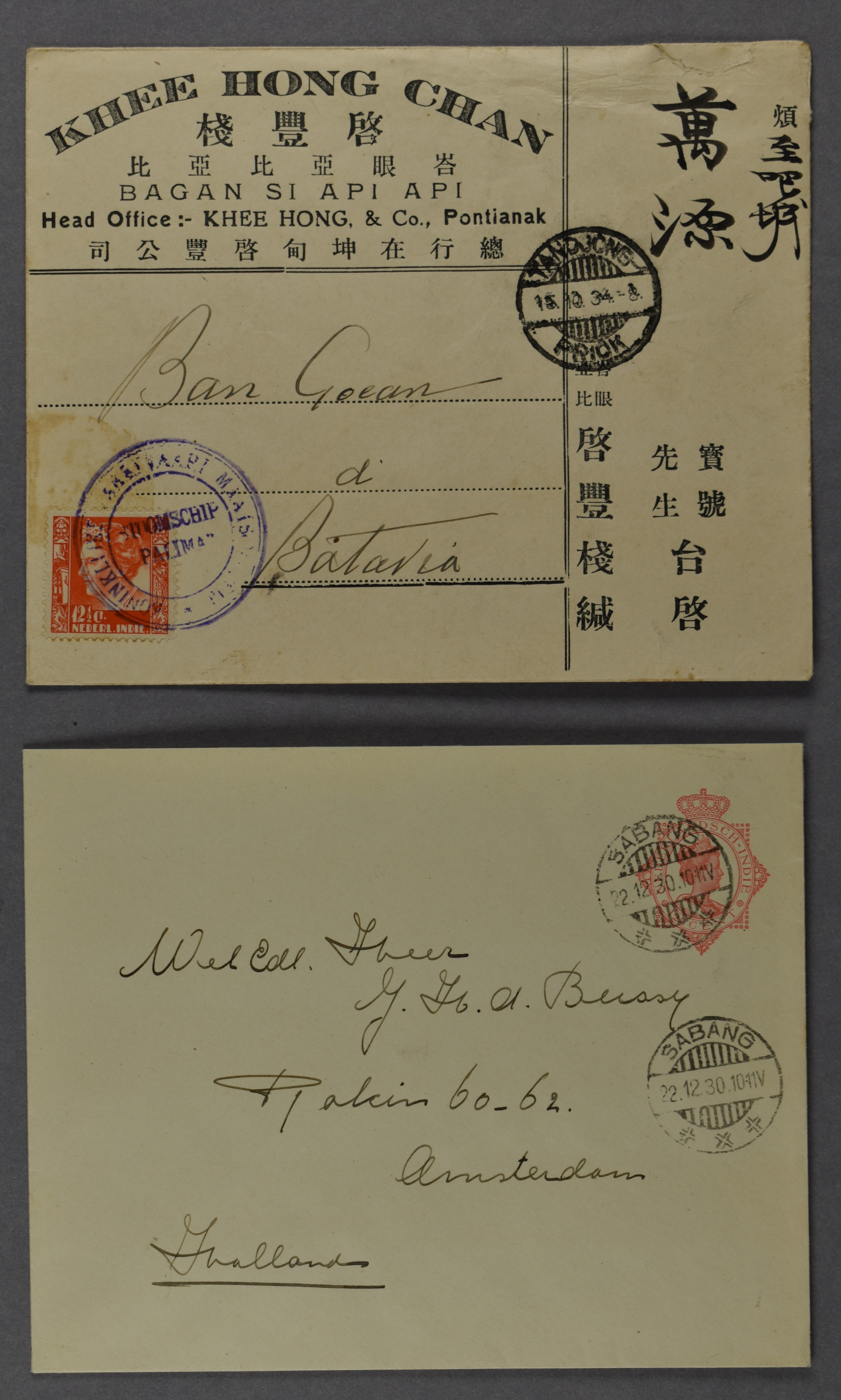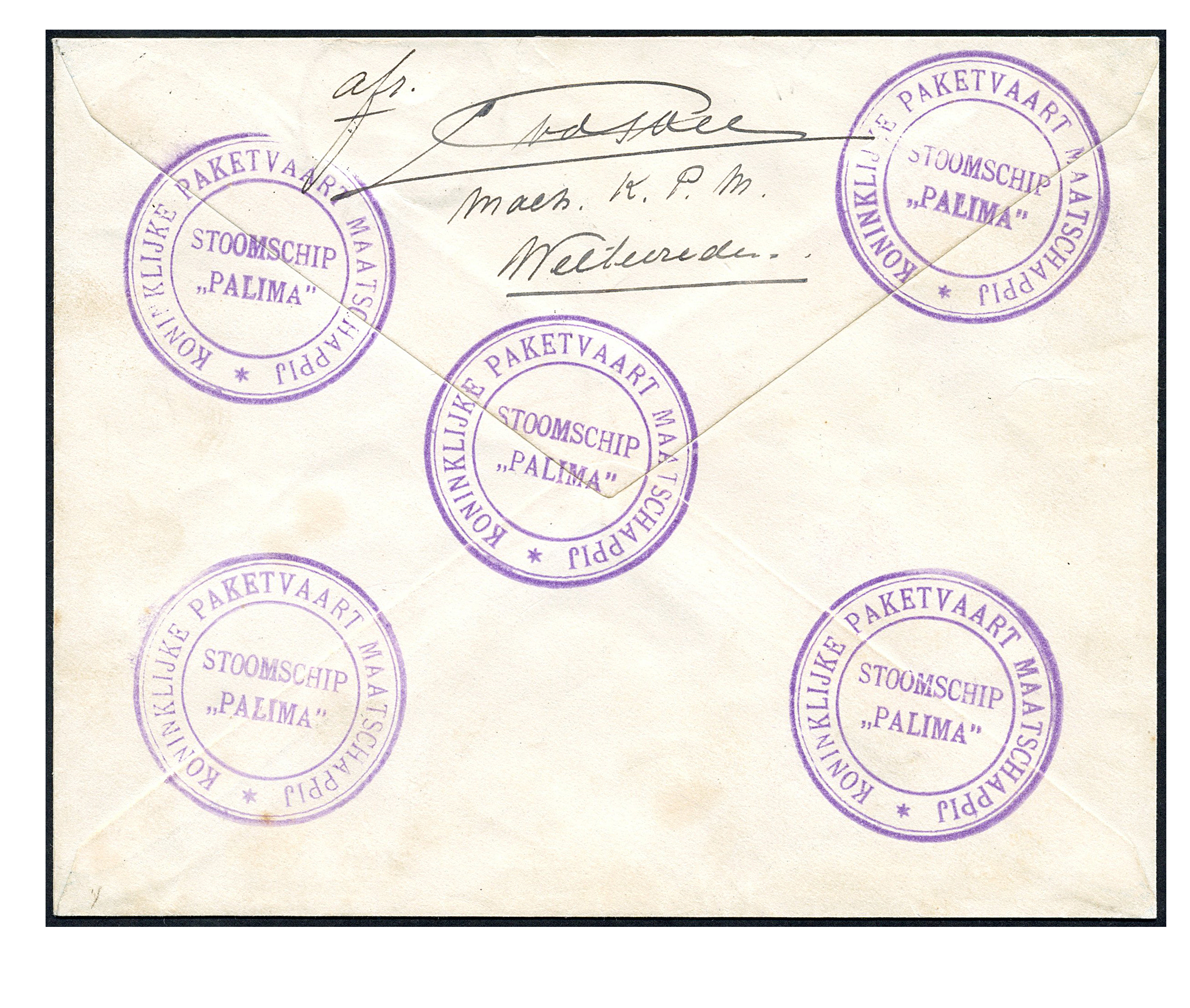 Sabang 22-12-1930 naar Amsterdam met op de az. 5 mooie afdrukken van het KPM-rondstempel 'STOOMSCHIP / "PALIMA"' (Image) (Image2)