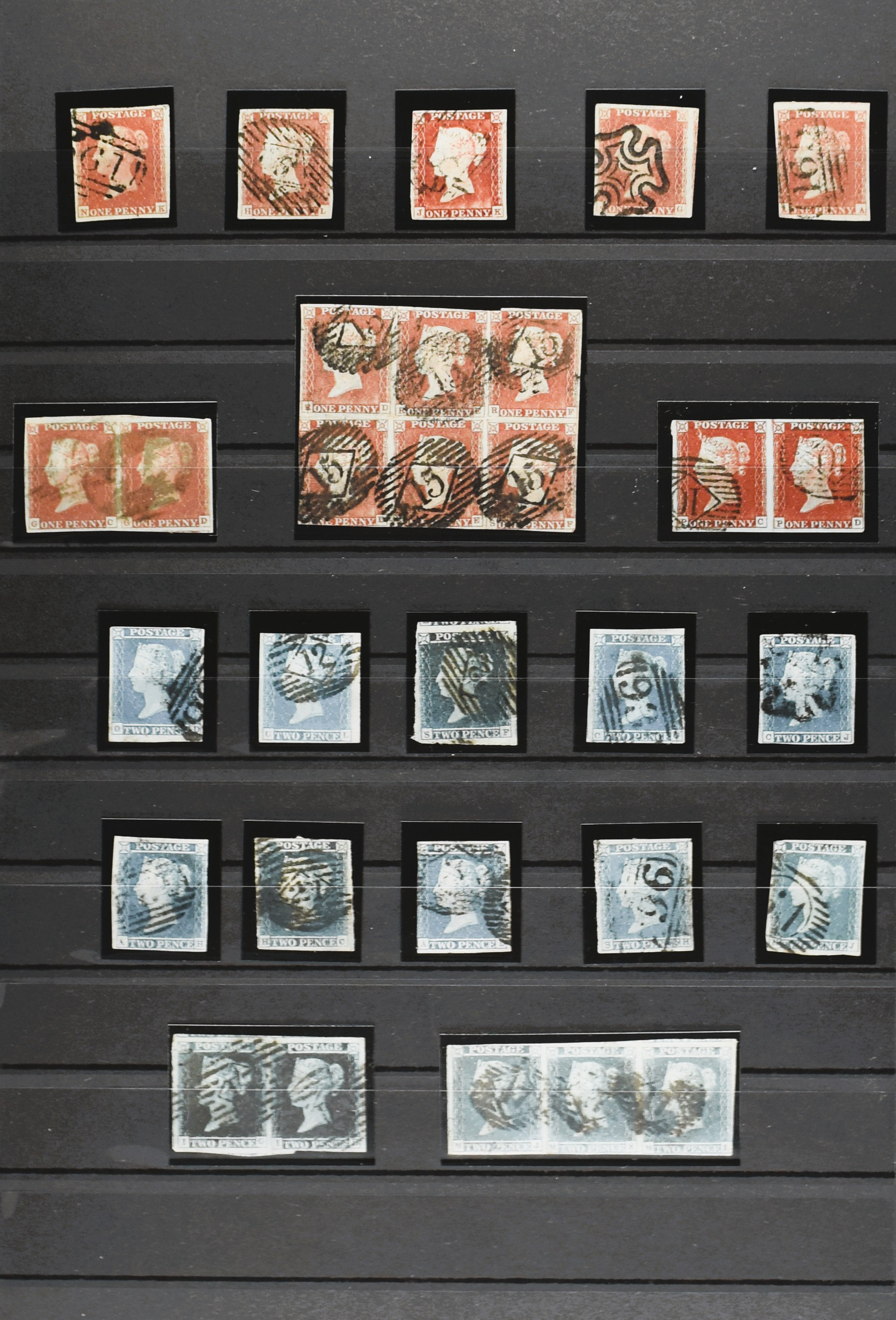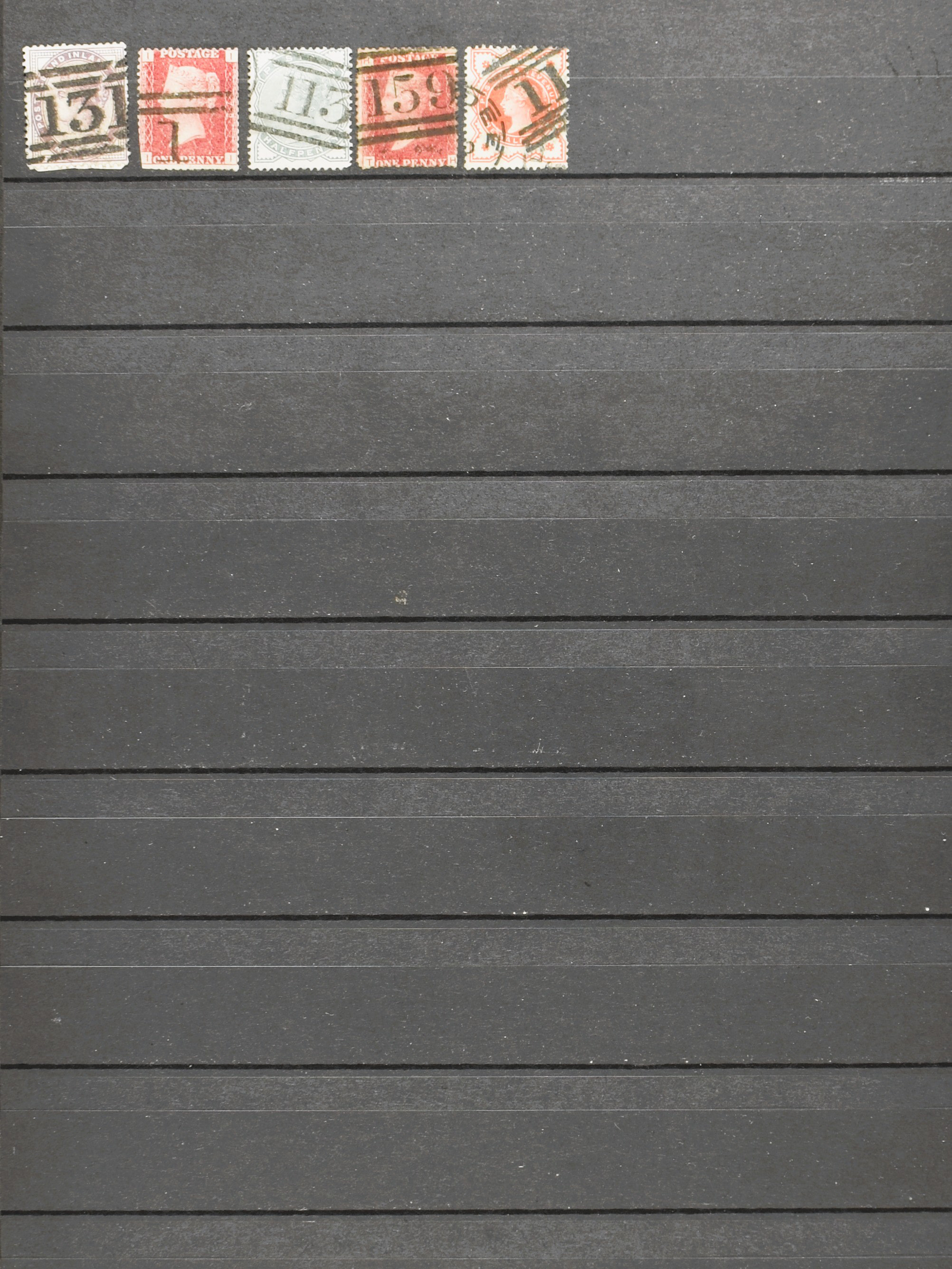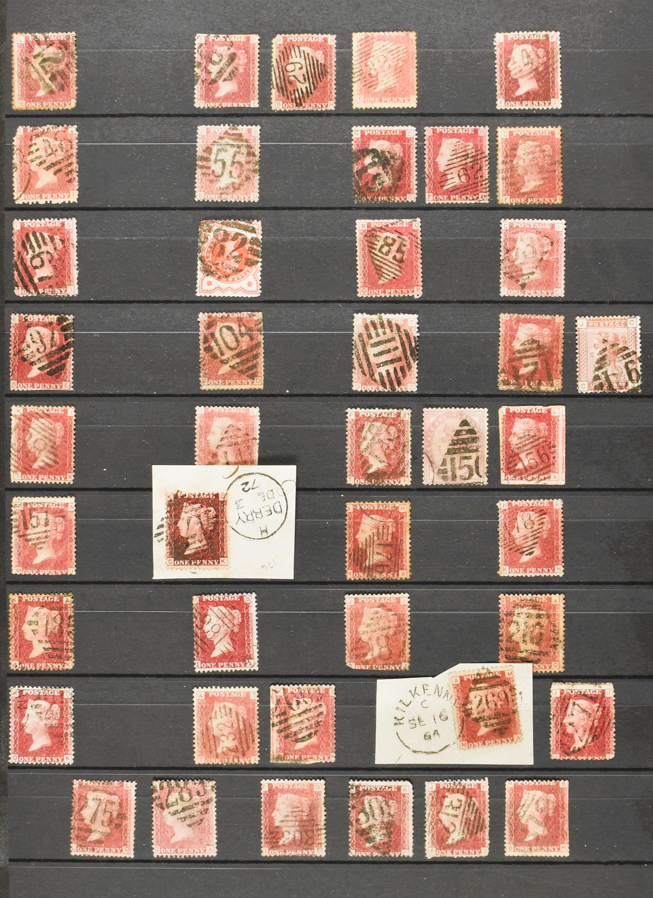 GREAT BRITAIN, small collection of 1844 type postmark, numbered obliterations of varied type, on Victorian stamps, 1 cover and also 3 copies of the Penny Black in mixed quality on 3 stock cards (Image) (Image2)