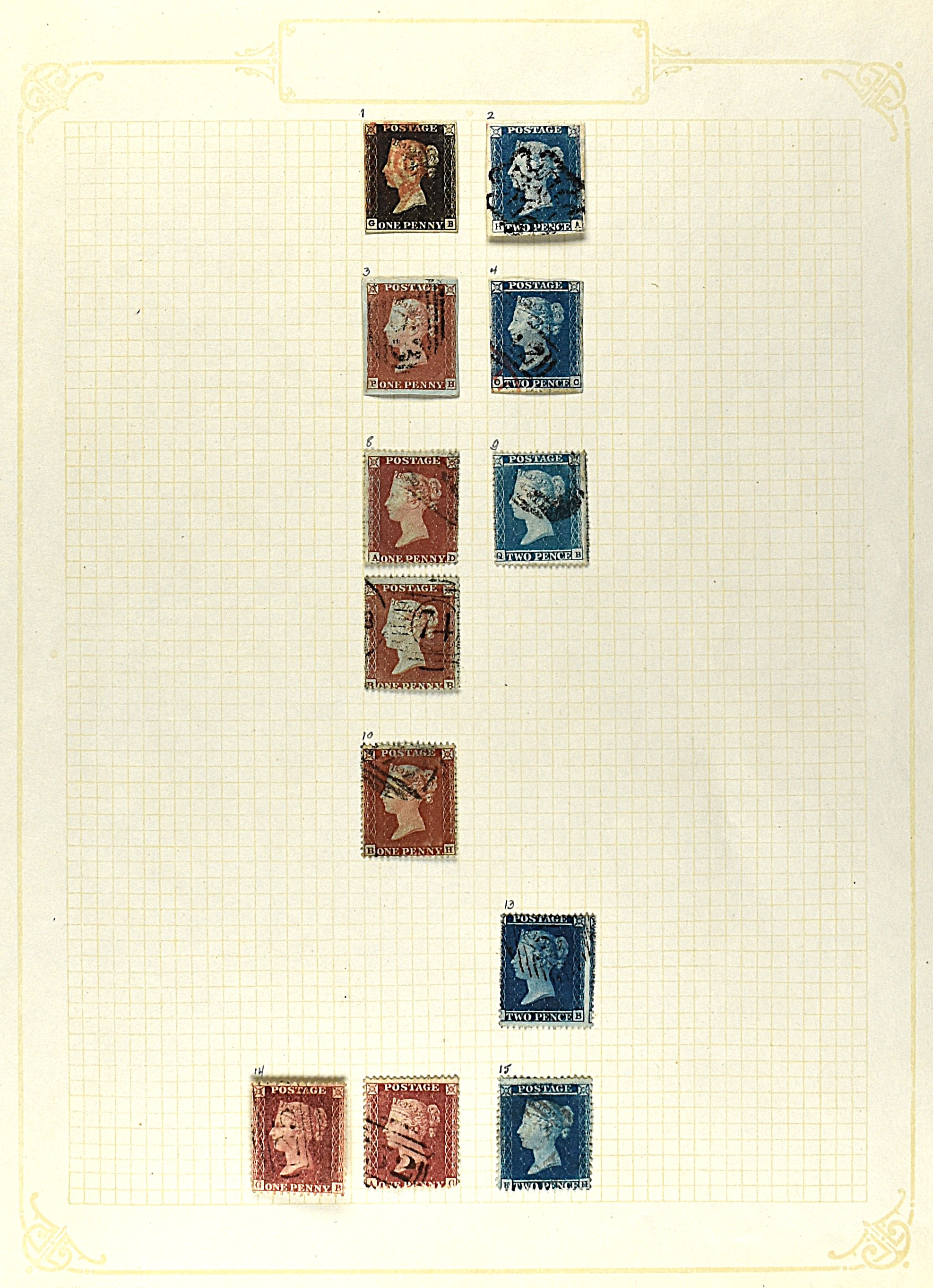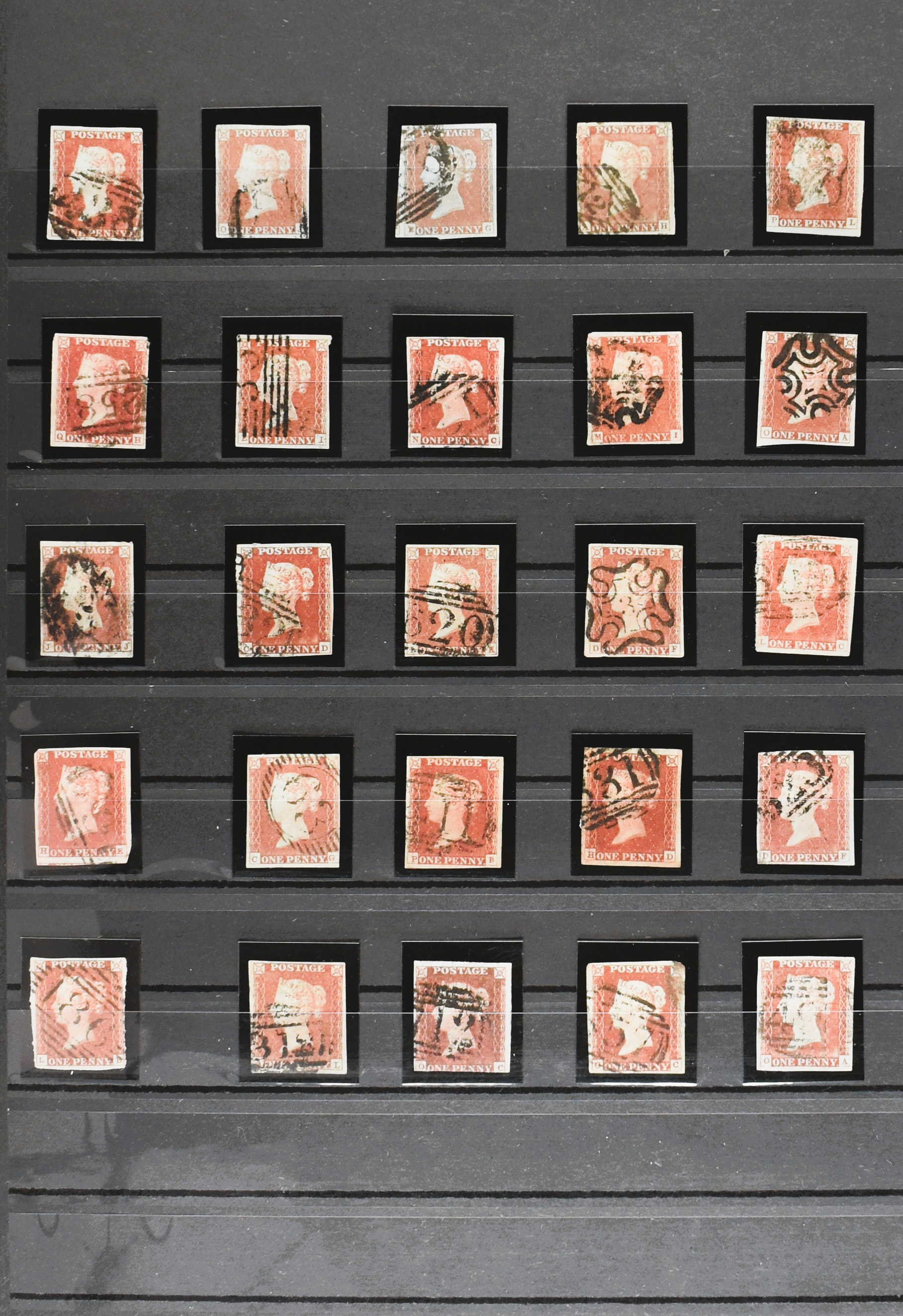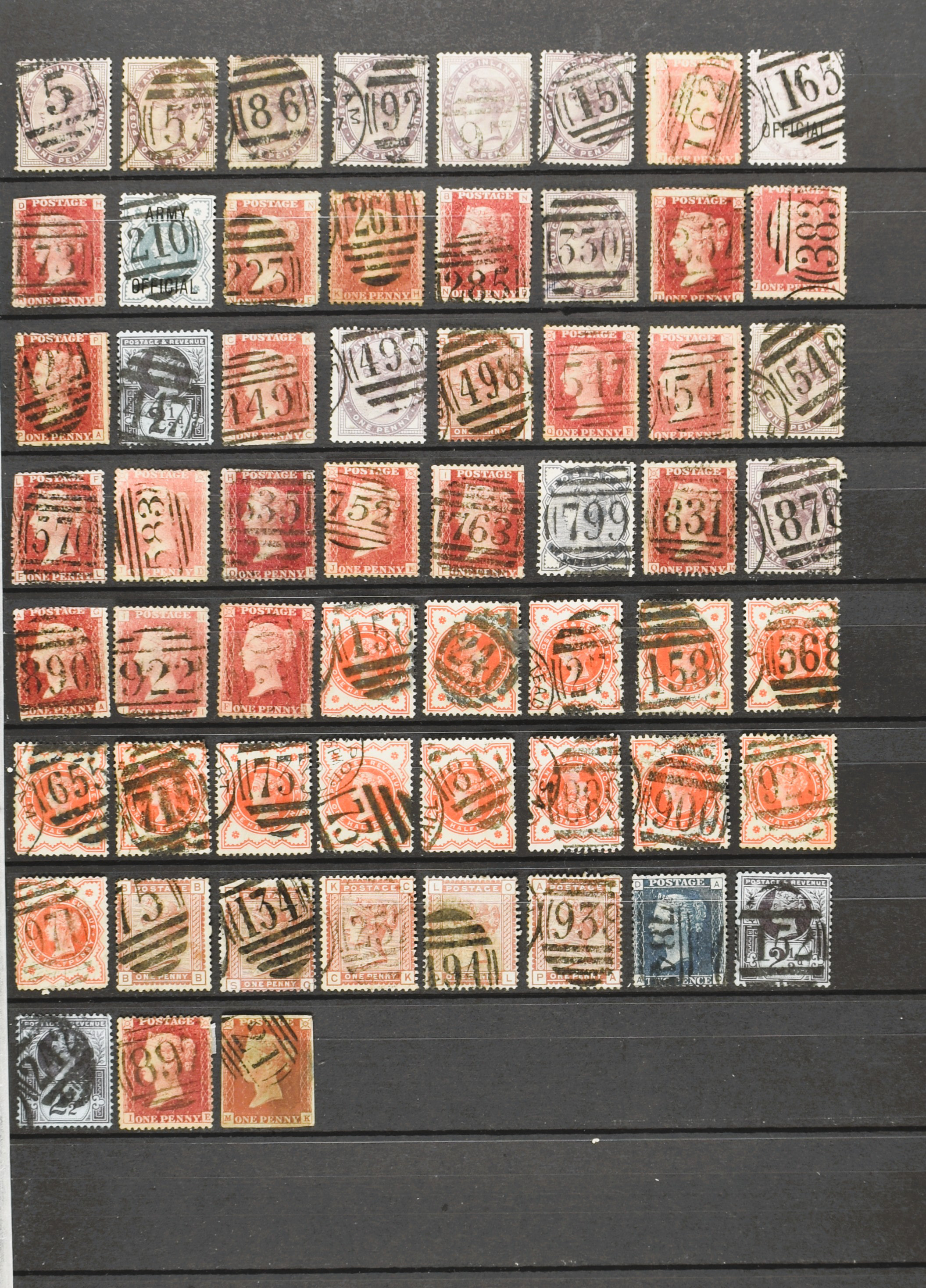 GREAT BRITAIN, small collection of 1844 type postmark, numbered obliterations of varied type, on Victorian stamps, 1 cover and also 3 copies of the Penny Black in mixed quality on 3 stock cards (Image) (Image2)