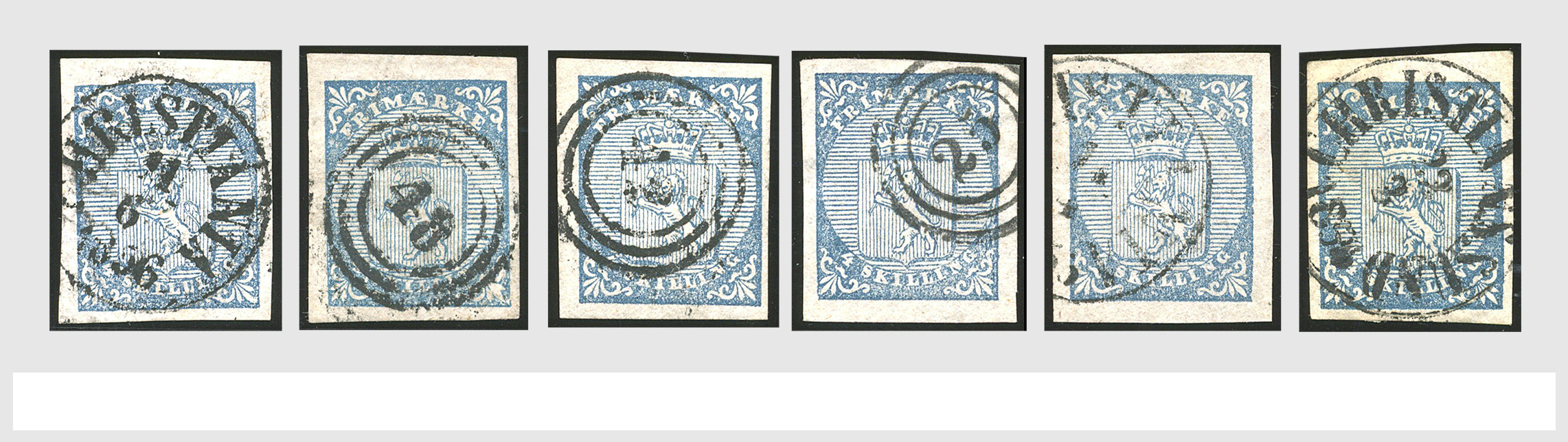 2163 imageNORWAY 1855, Mi. no.1, 4 Sk. Blue, 21 ex. mostly in nice quality, with several nice cancellations. (Image) (Image2) (Image3) (All Images)