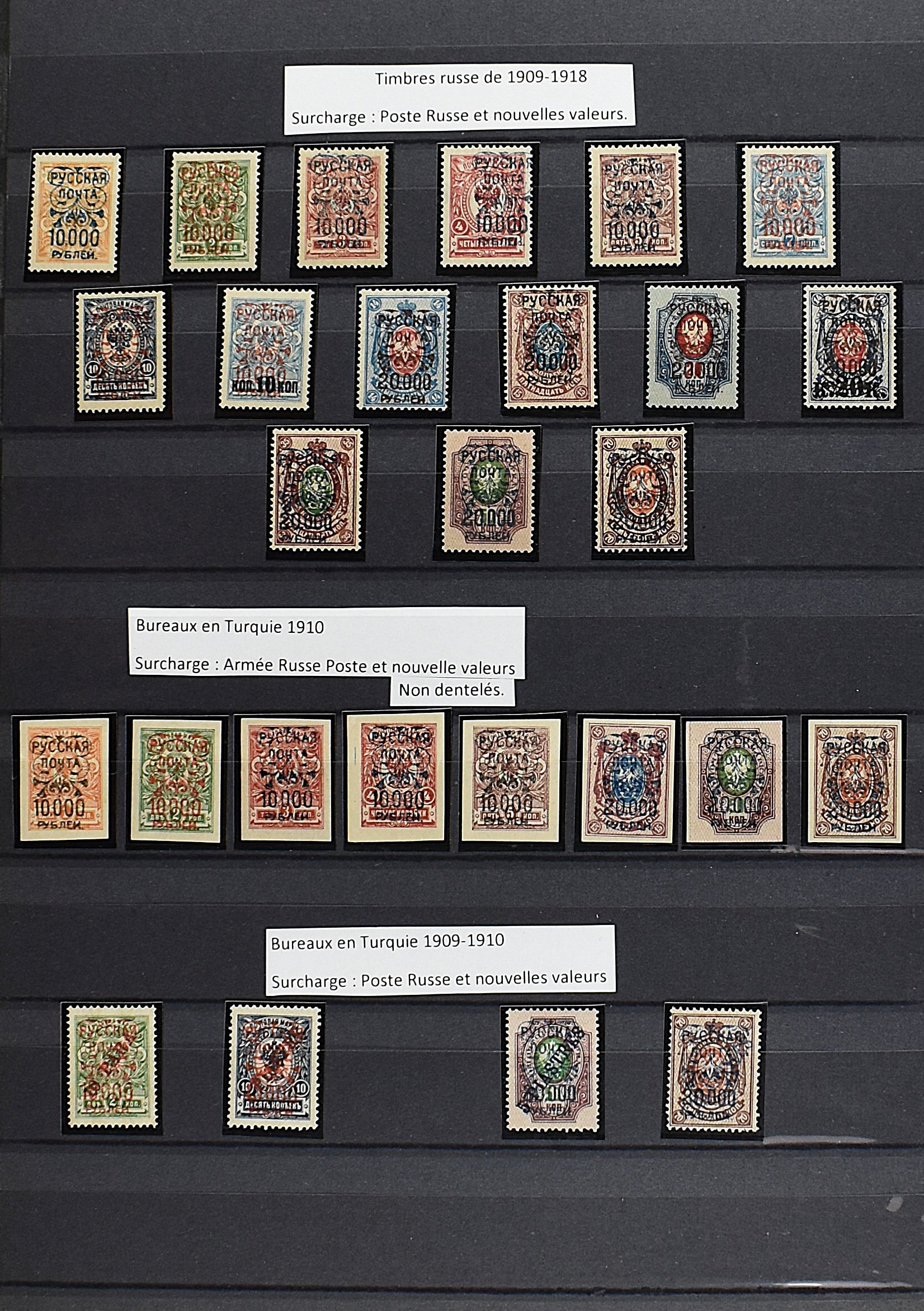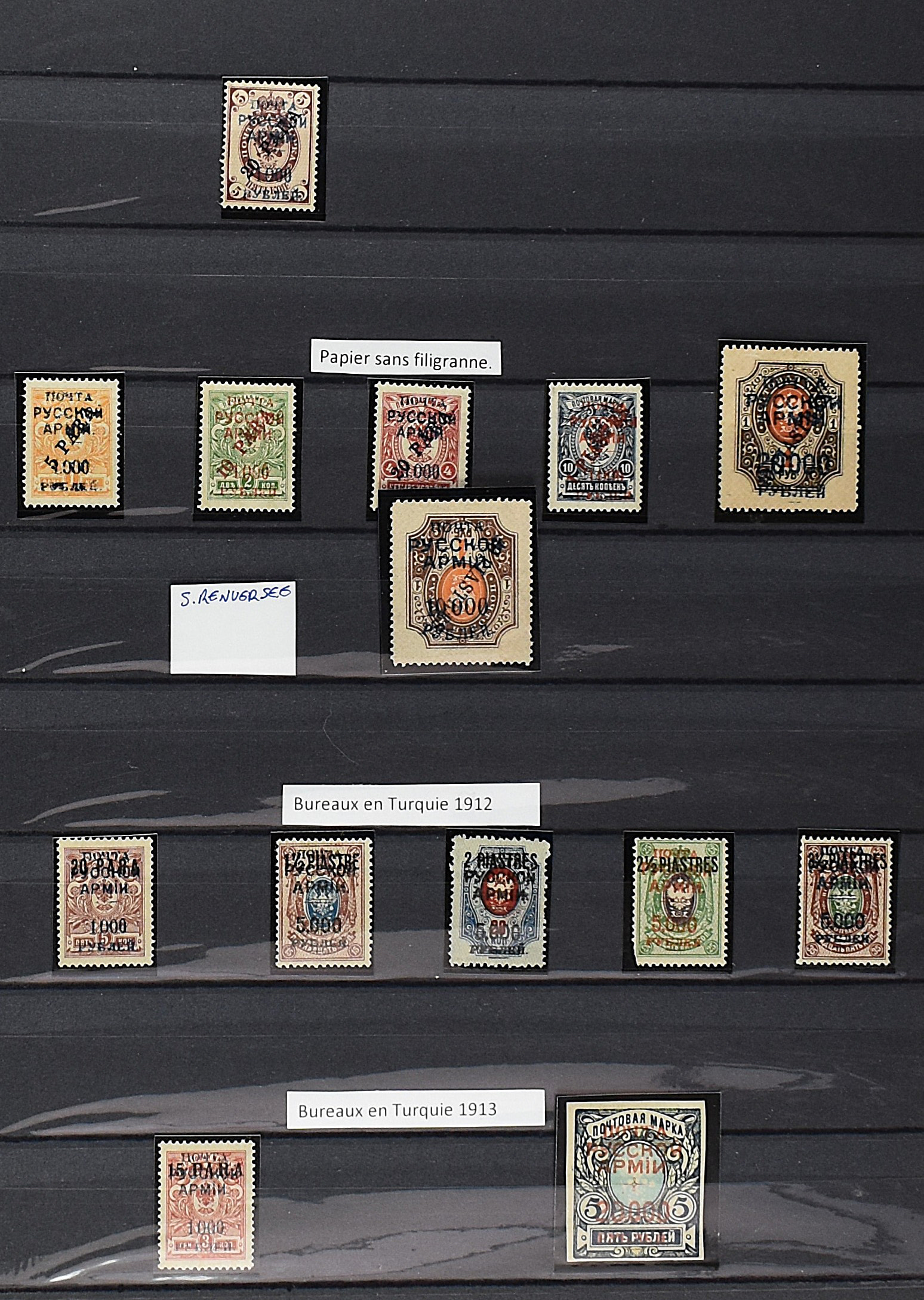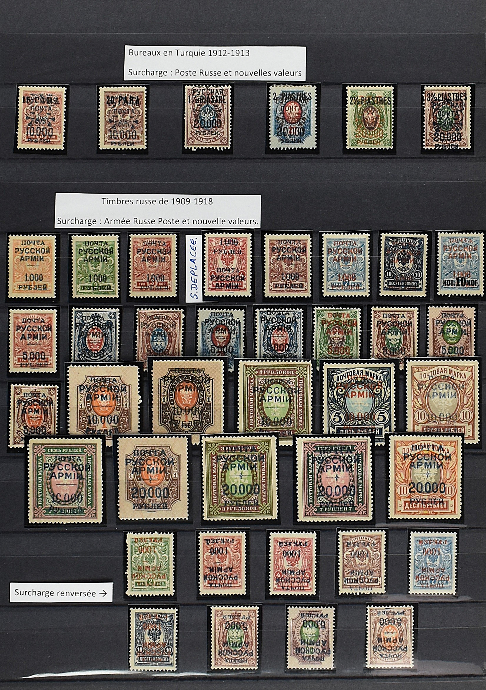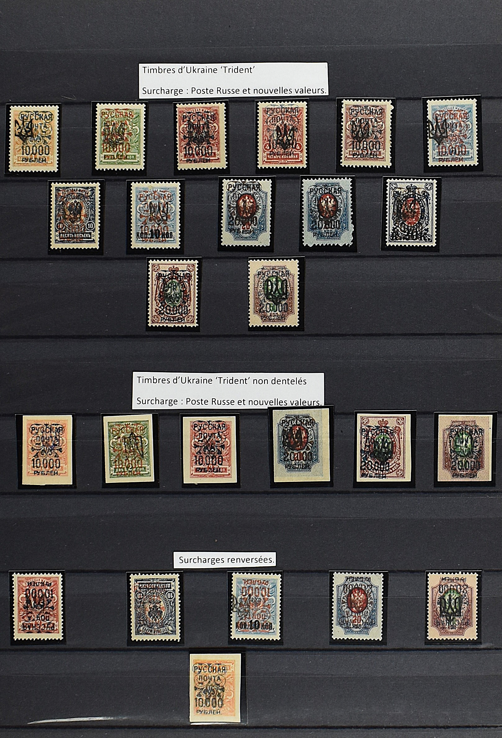 2165 imageRUSSIA 1920-1921, WRANGLER ARMY, with f.i.: Issue 'Denikin' imperforated incl. 5000R orange with inverted opt, Ukrainian stamps 'Trident' perforated as well as imperforated including inverted opts, Russian stamps overprinted with new values perforated and imperforated and a lot of printing errors, paper varieties etc., beautiful lot with scarce material and a high value! (Image) (Image2) (Image3) (Image4) (Image5) (Image6) (All Images)