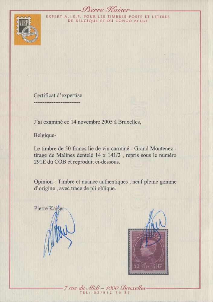 2056 nh imageN° 291E "50fr. crimson" (with gum crease) with photo certificate Kaiser, f (OBP €1,750)(Image 1) (Image 2)