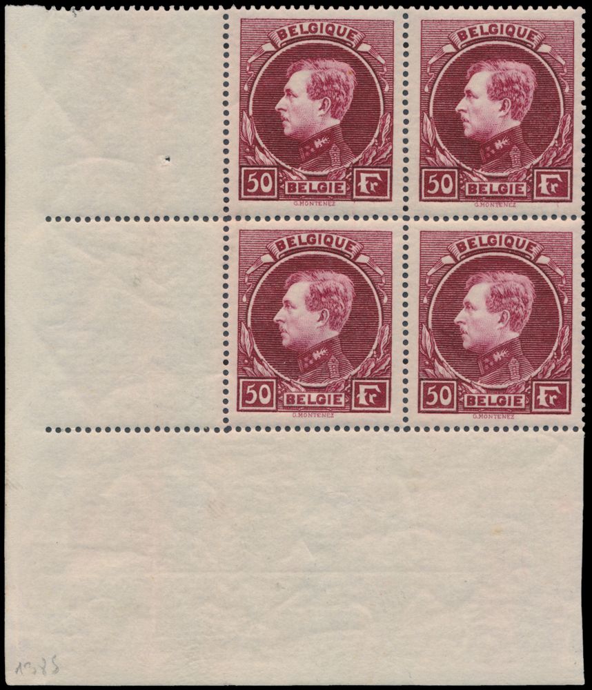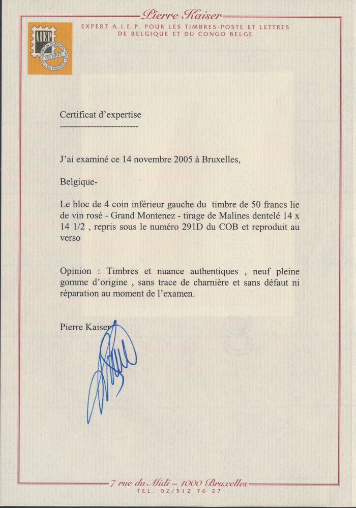 2057 nh imageN° 291D "50fr. pink-wine red" in block of four in corner piece, with photo certificate Kaiser, beautiful, vf (OBP €1,540)(Image 1) (Image 2)