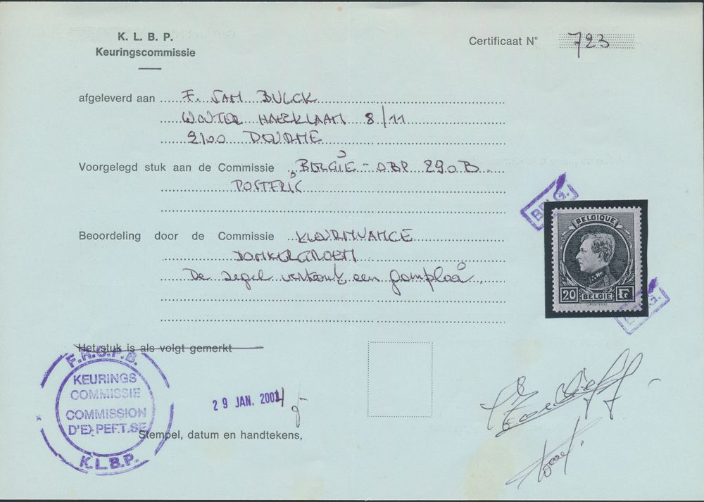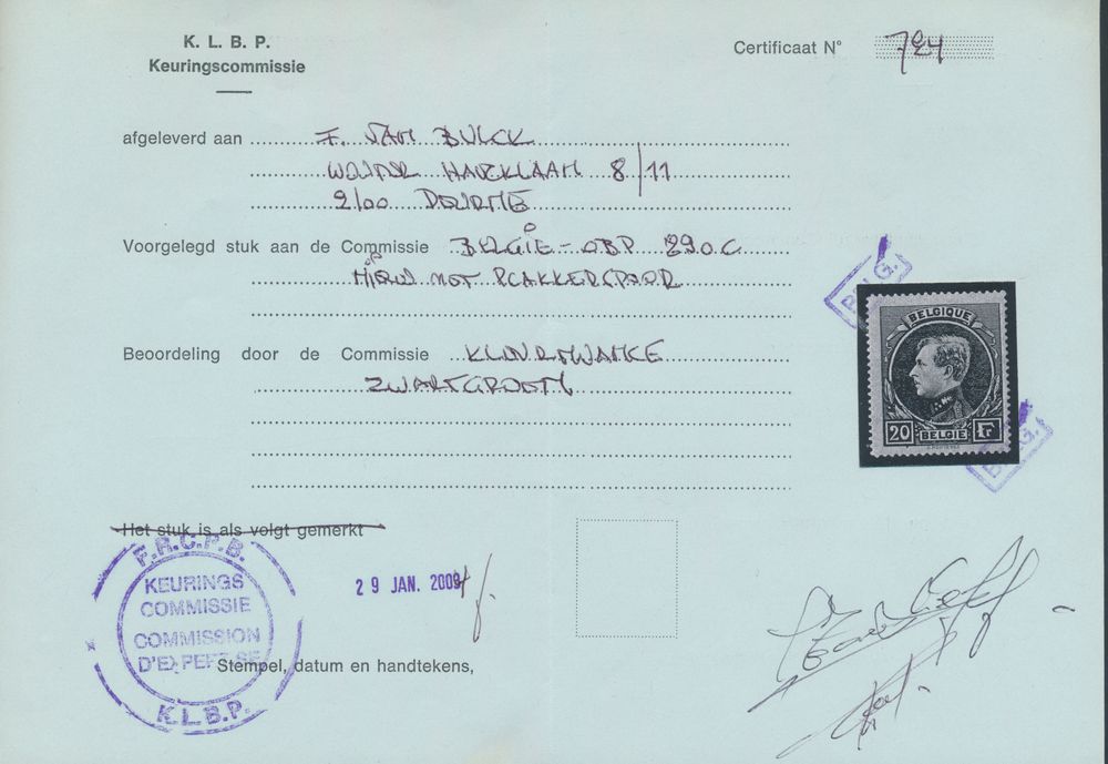 2055 og imageN° 290C "20fr. black green" with photo certificate KLBP, vf/f (OBP €6,000) - see photo cover(Image 1) (Image 2)